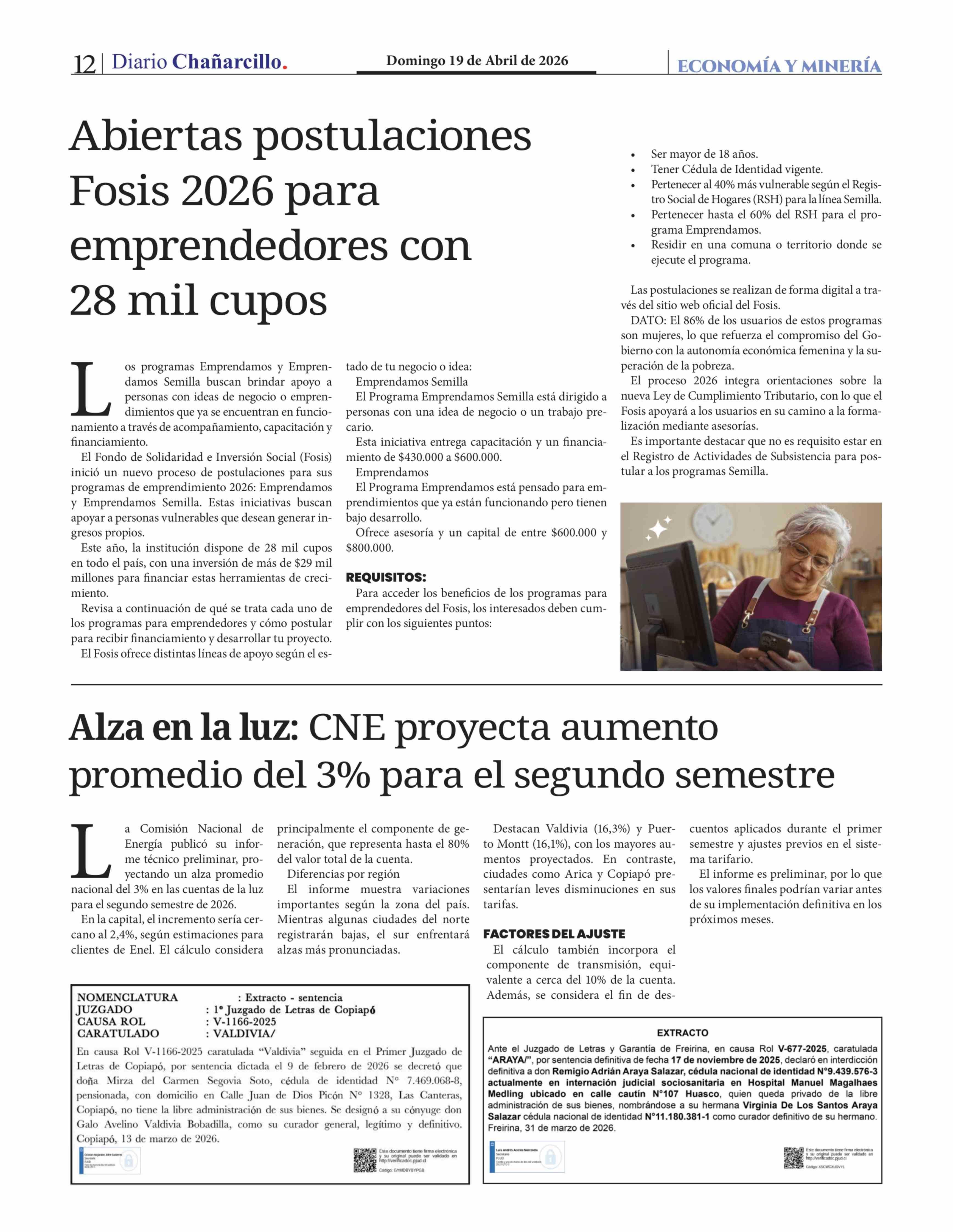 Alza en la luz: CNE proyecta aumento promedio del 3% para el segundo semestre 19-04-2026 Diario Chañarcillo |
