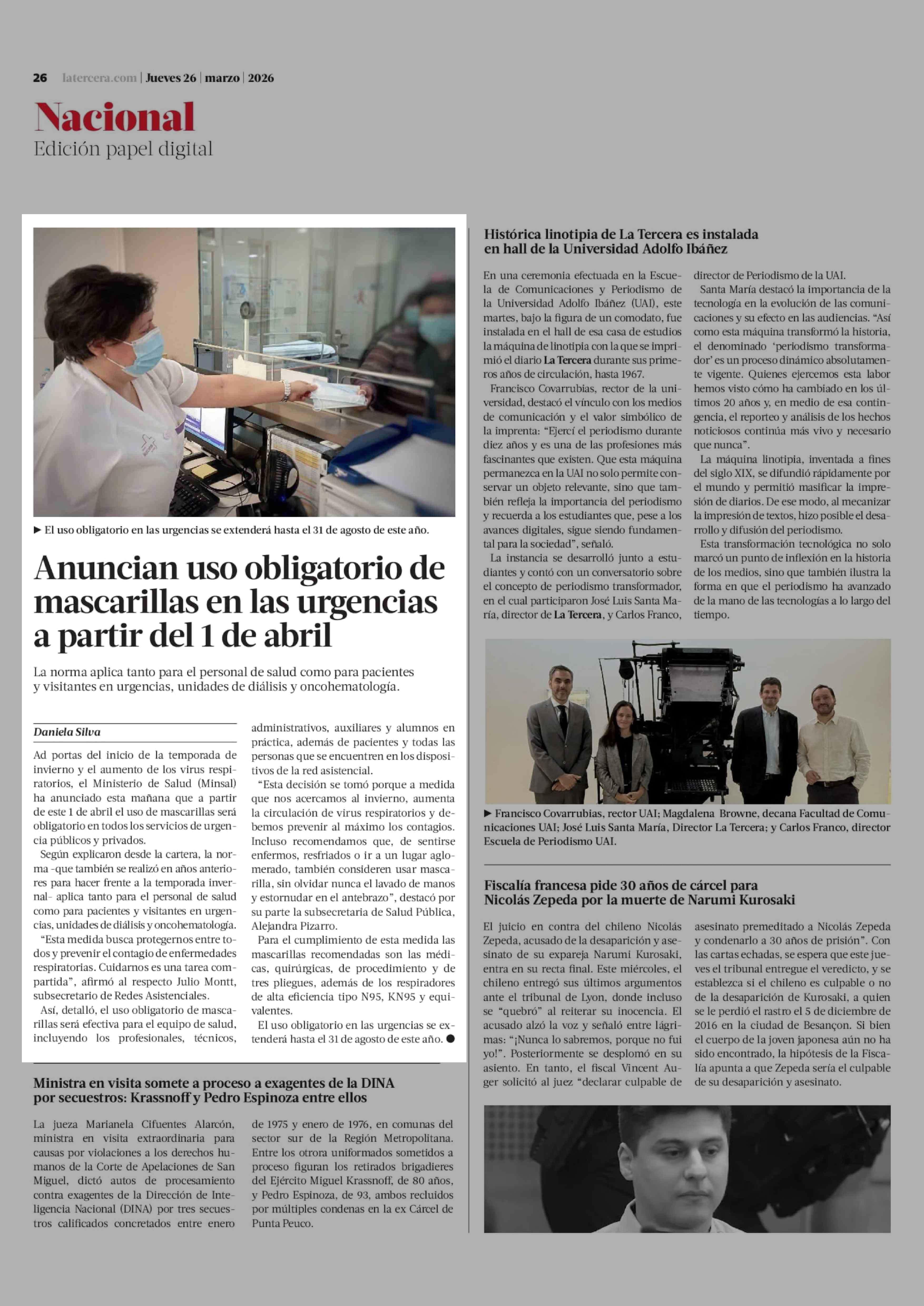 Anuncian uso obligatorio de mascarillas en las urgencias a partir del 1 de abril 26-03-2026 La Tercera |