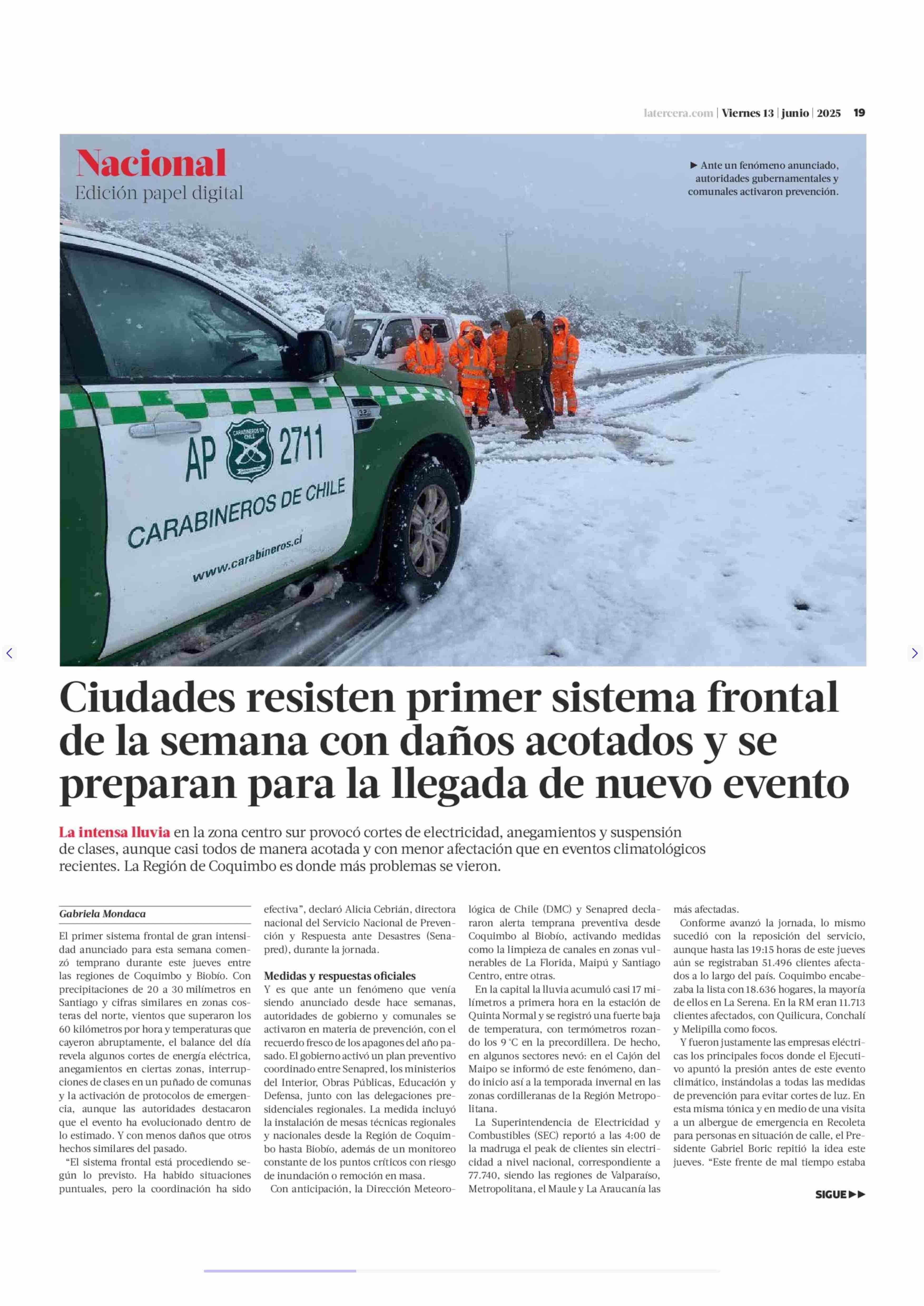 Ciudades resisten primer sistema frontal de la semana con daños acotados y se preparan para la llegada de nuevo evento 13-06-2025 La Tercera |