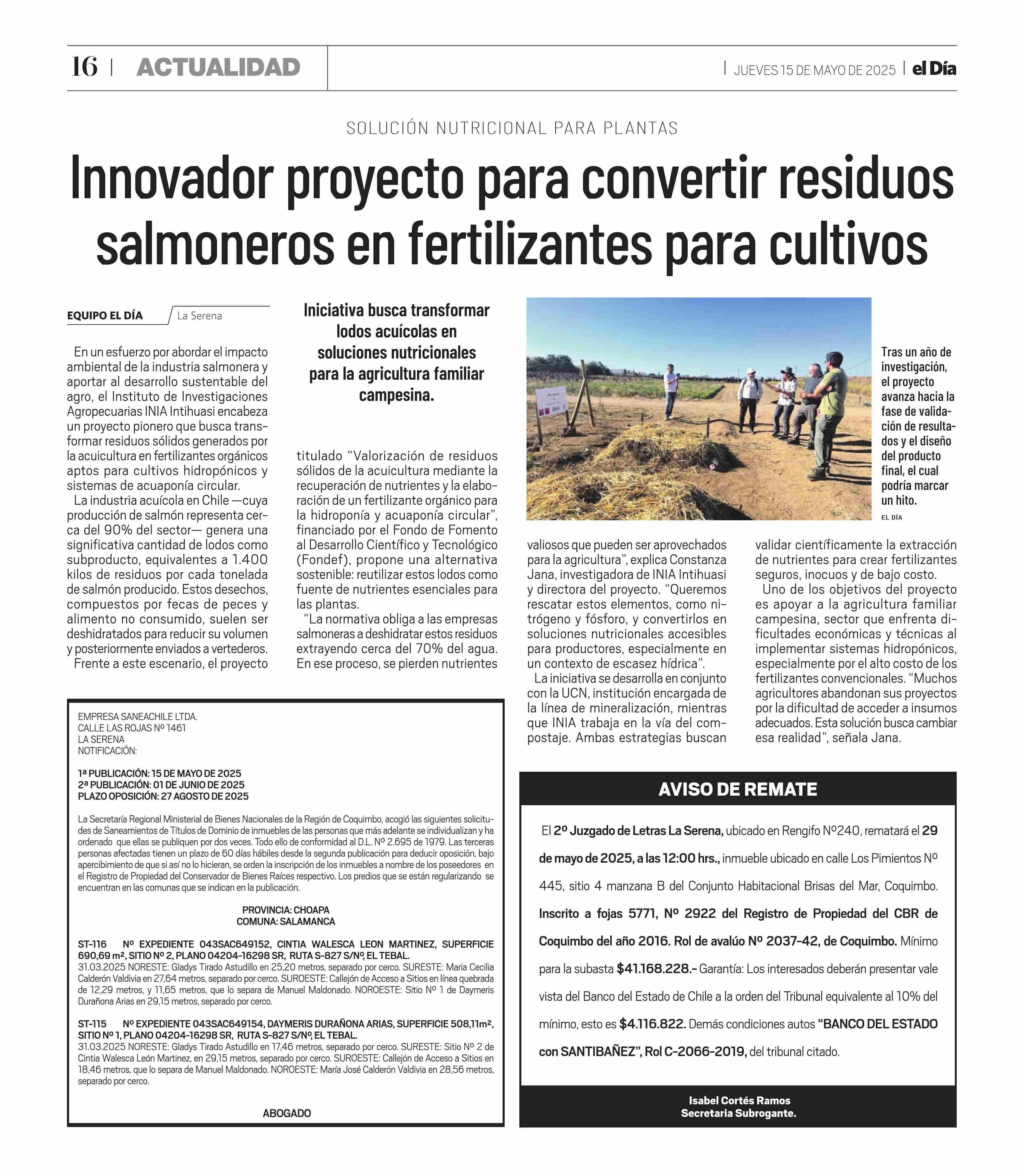 Extractos: EMPRESA SANEACHILE LTDA. CALLE LAS ROJAS N° 1461 LA SERENA NOTIFICACIÓN: 15-05-2025 El Día |