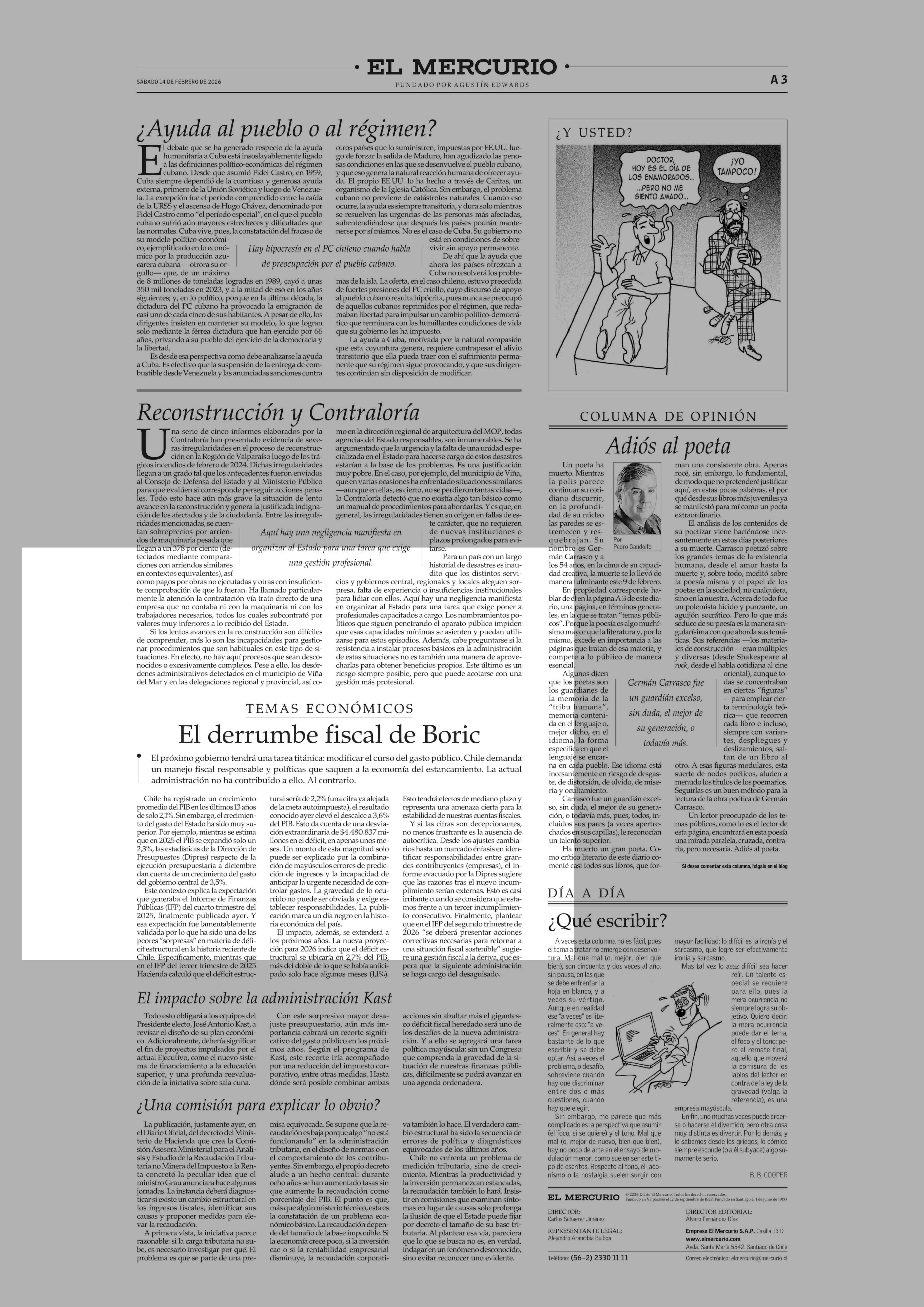 Editorial: Reconstrucción y Contraloría 14-02-2026 El Mercurio |