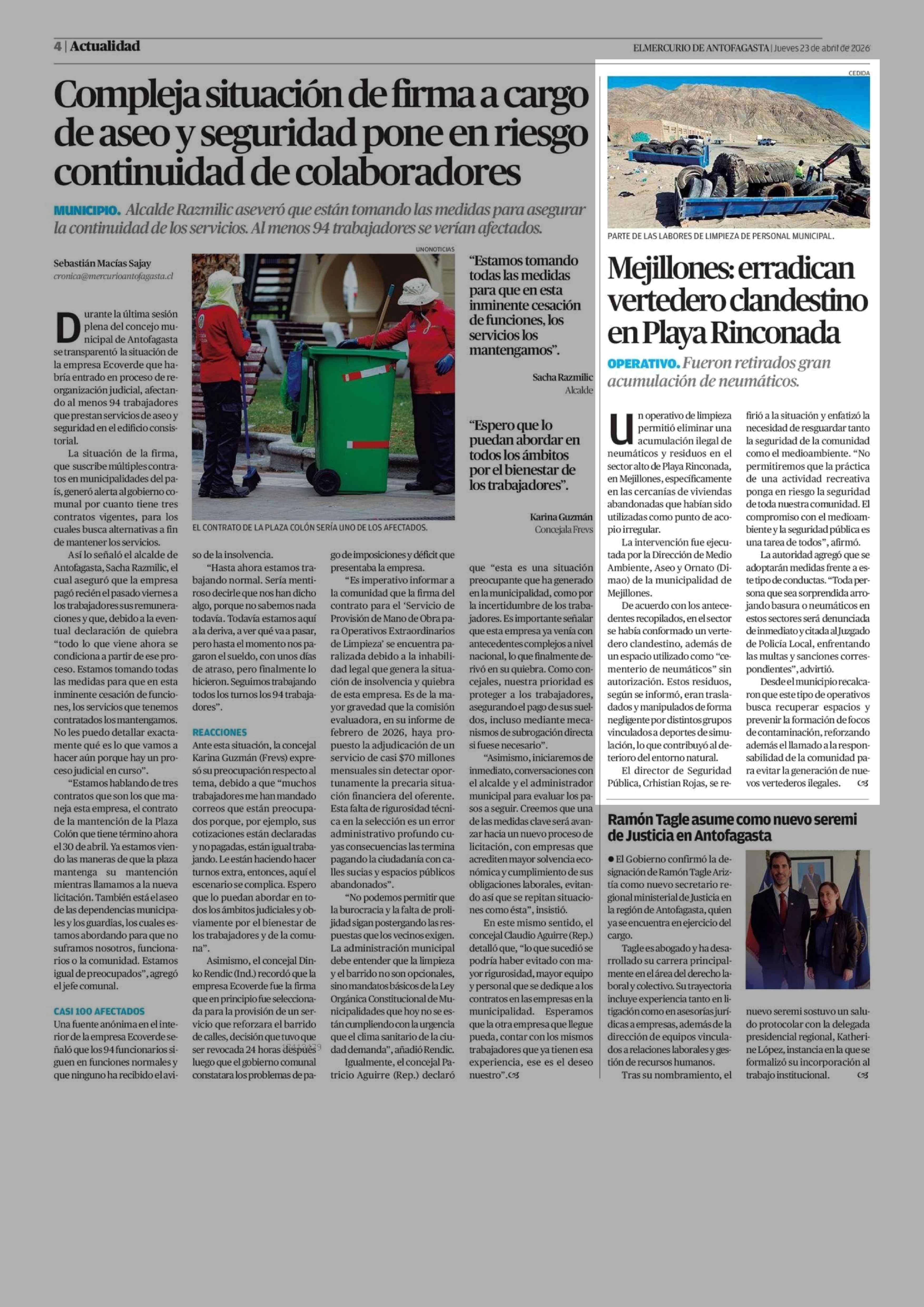 Mejillones: erradican vertedero clandestino en Playa Rinconada 23-04-2026 El Mercurio de Antofagasta |