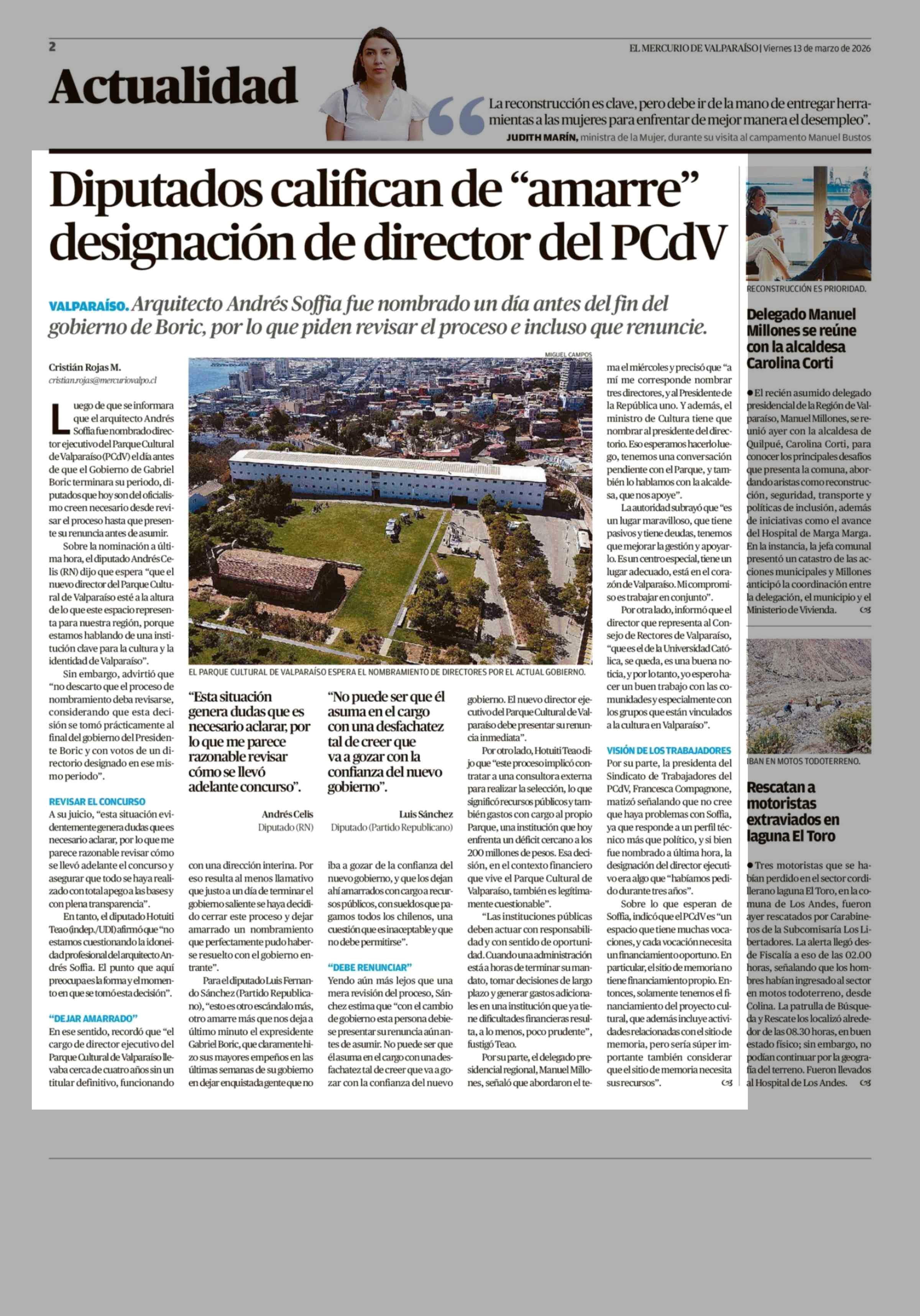 Diputados califican de "amarre" designación de director del PCdV 13-03-2026 El Mercurio de Valparaíso |