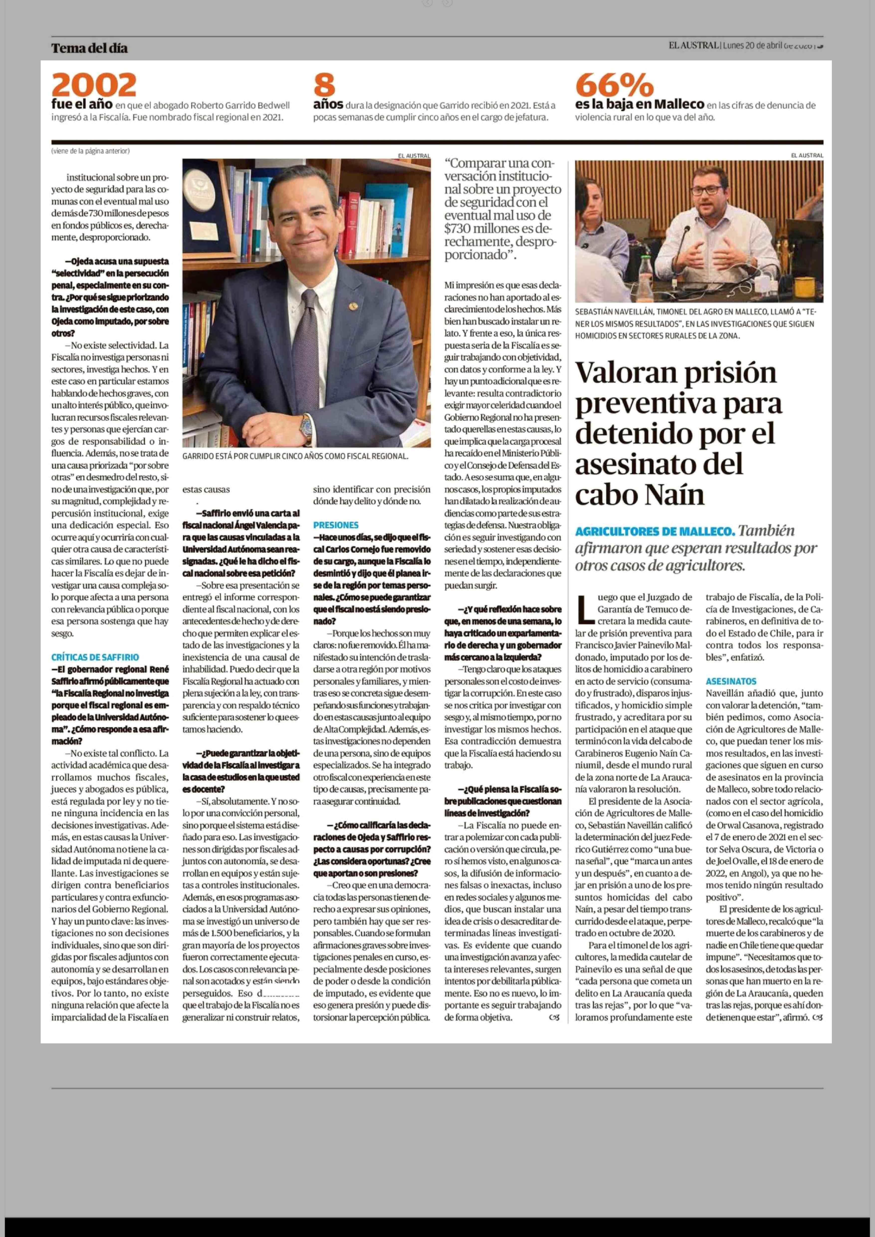 "Tengo claro que los ataques personales son el costo de investigar hechos de corrupción" 20-04-2026 El Austral de la Araucanía |