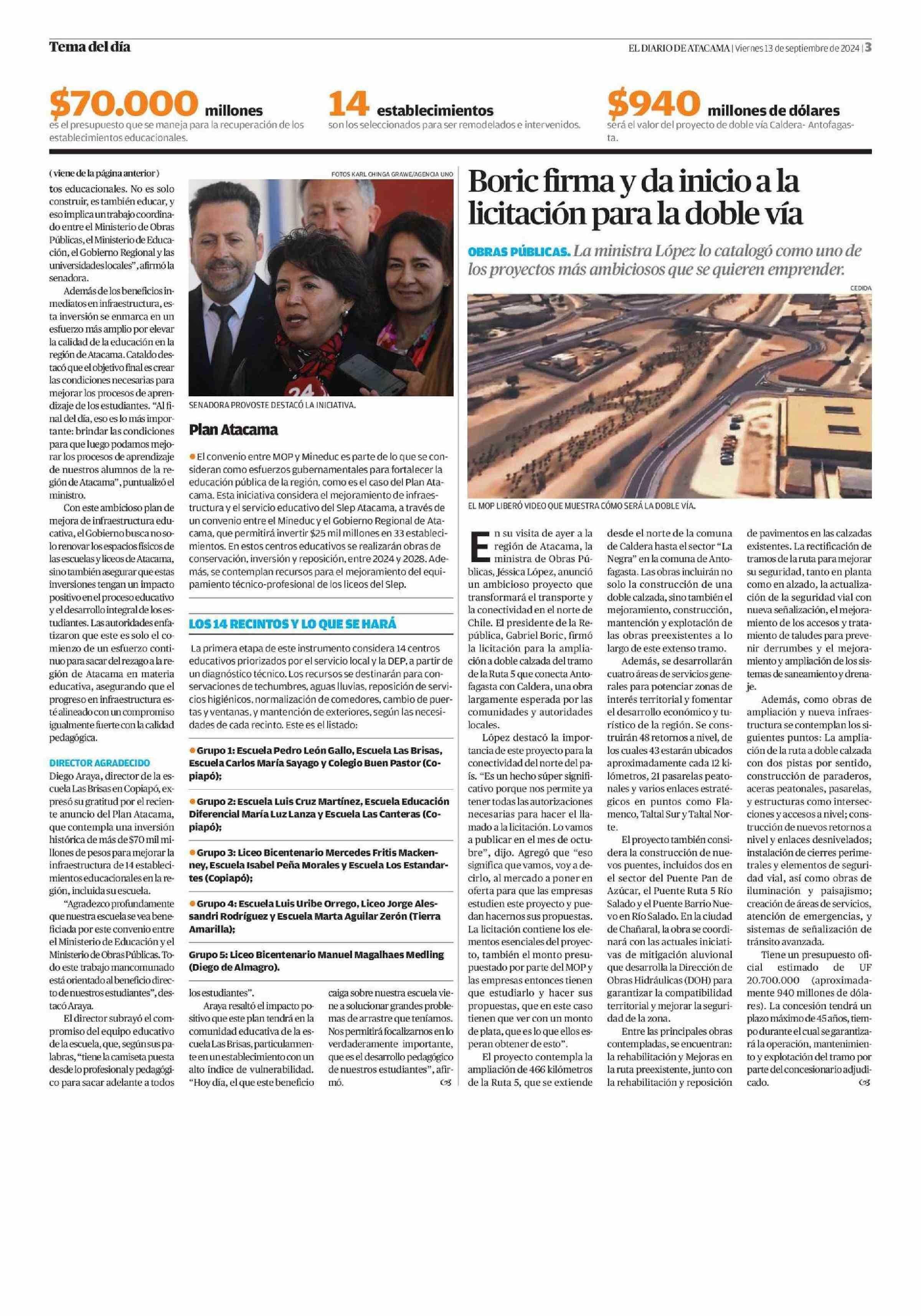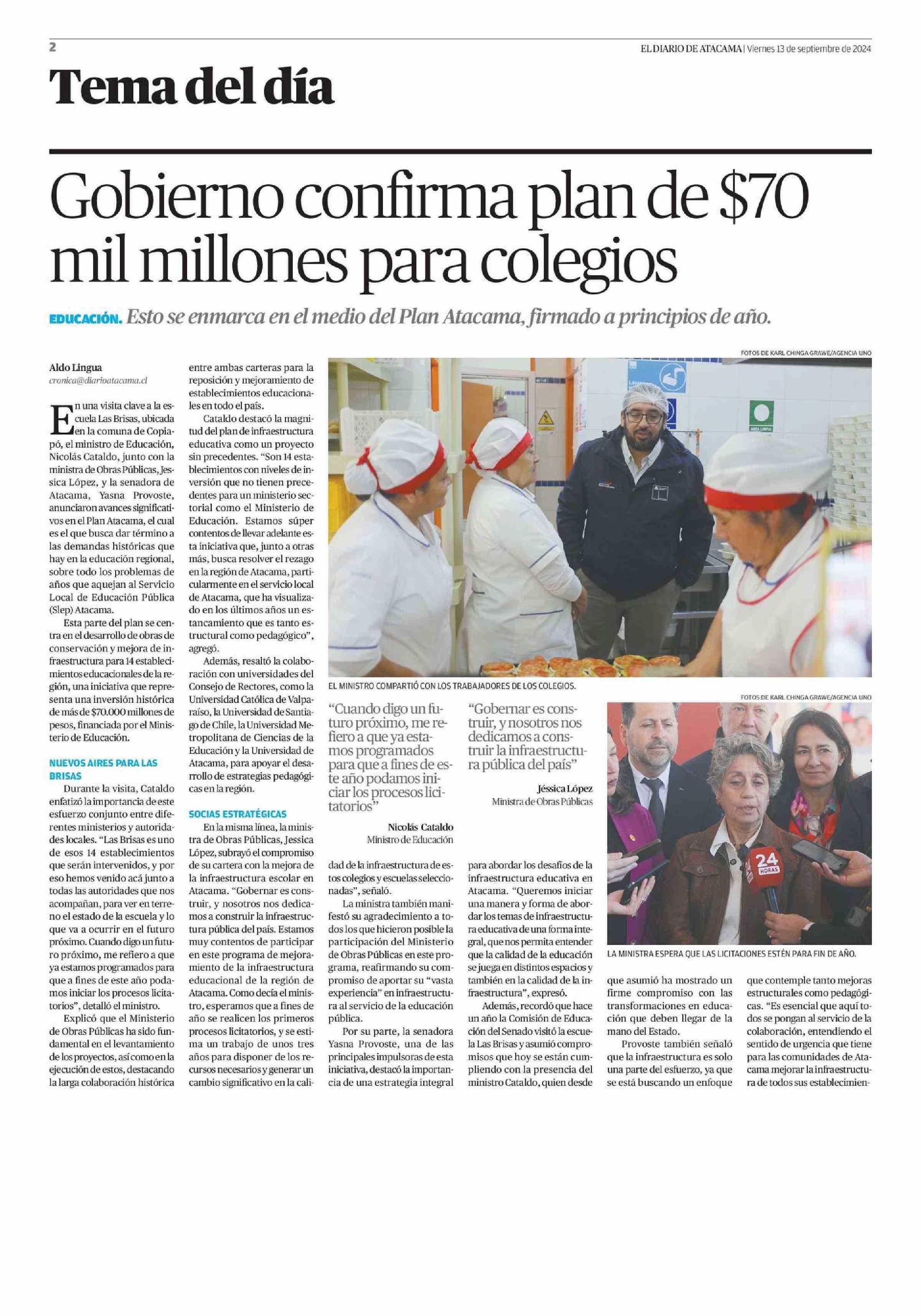Gobierno confirma plan de $70 mil millones para colegios 13-09-2024 El Diario de Atacama |