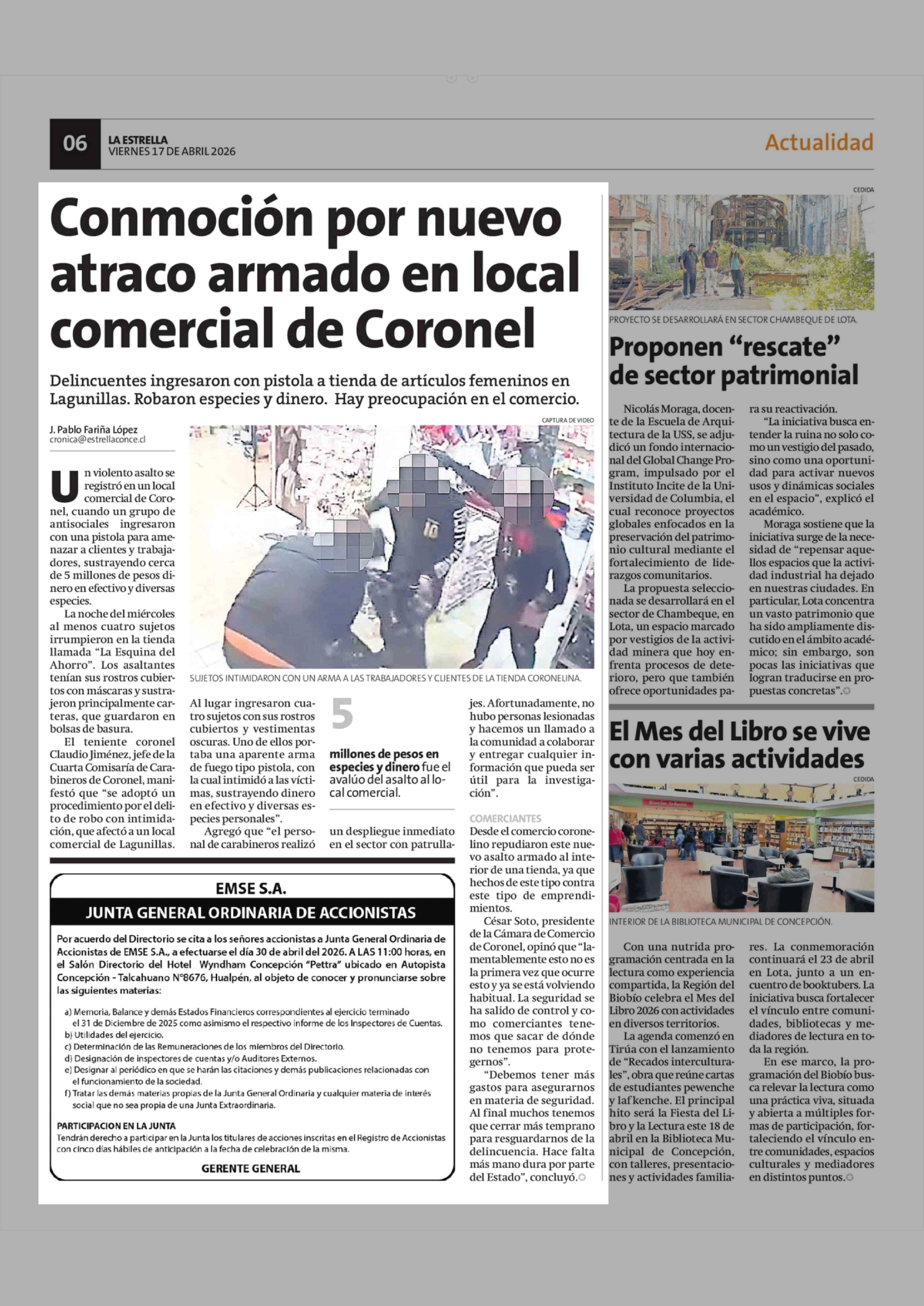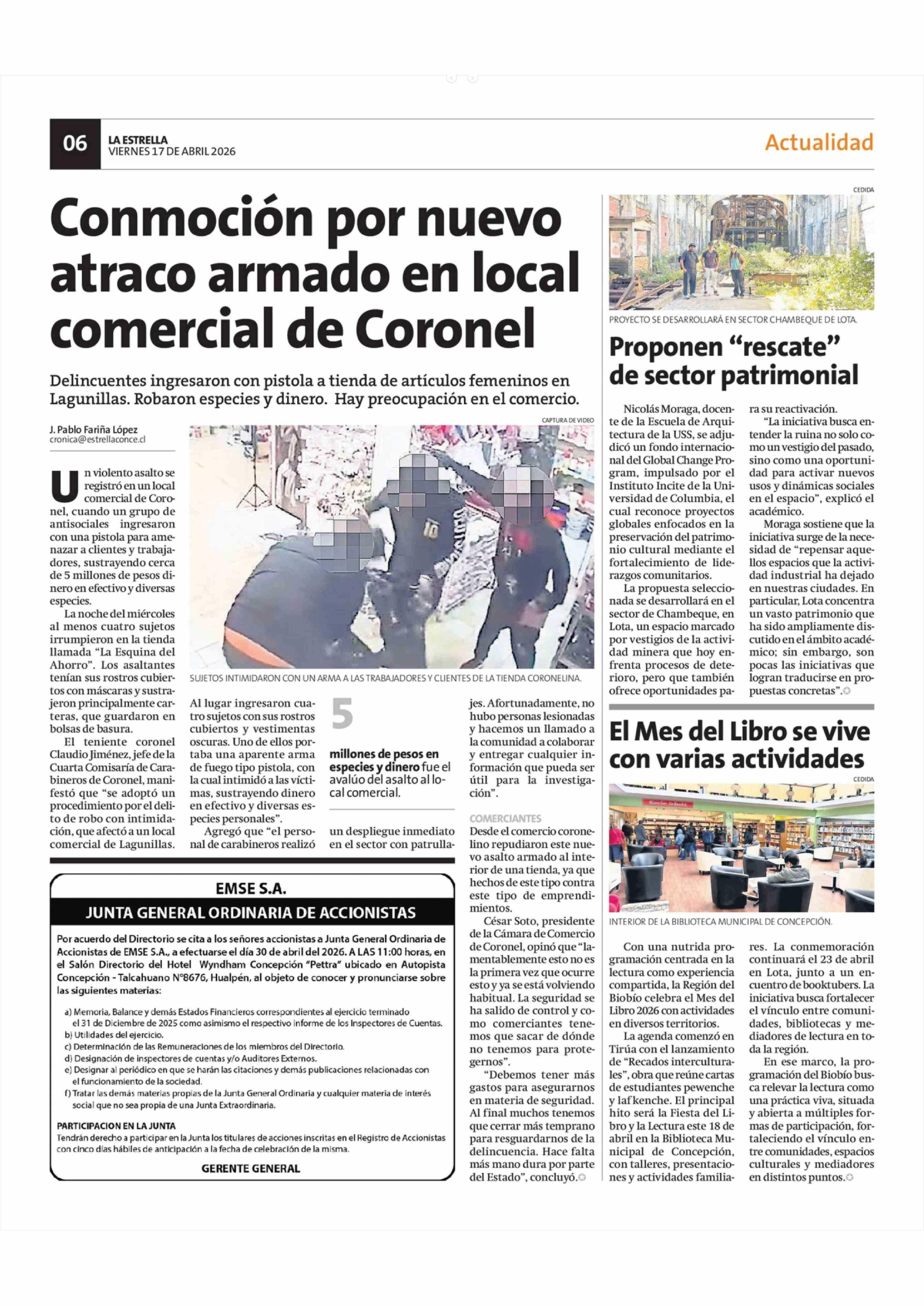 Conmoción por nuevo atraco armado en local comercial de Coronel 17-04-2026 La Estrella de Concepción |