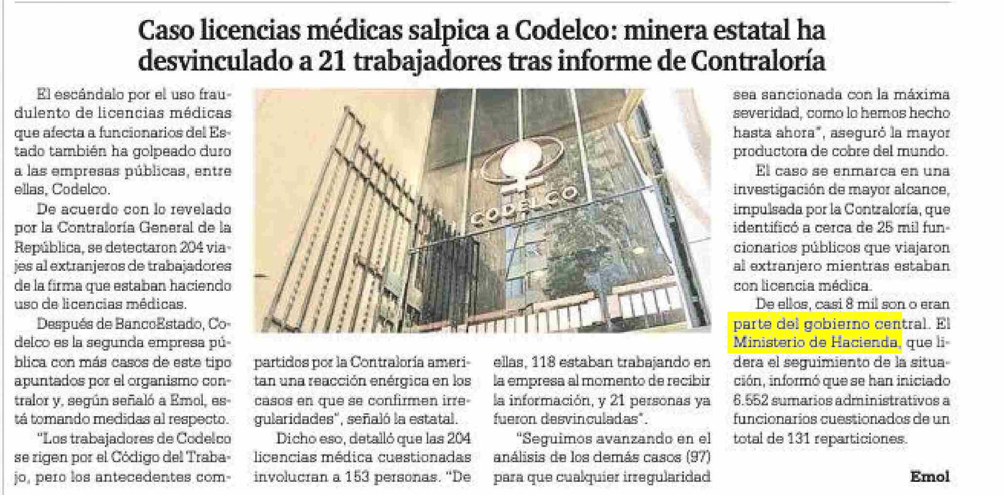 | Título: | Caso licencias médicas salpica a Codelco: minera estatal ha desvinculado a 21 trabajadores tras informe de Contraloría |
