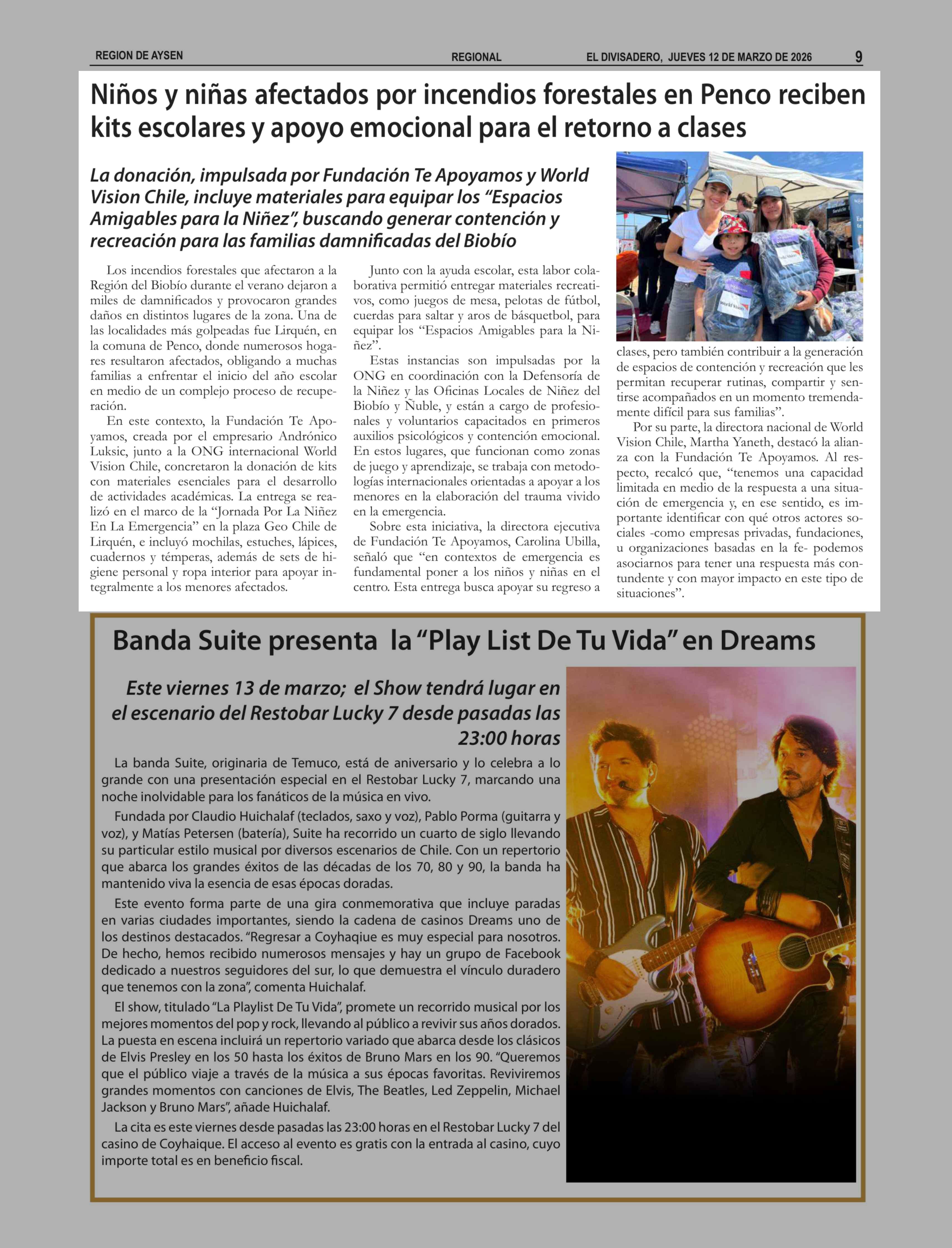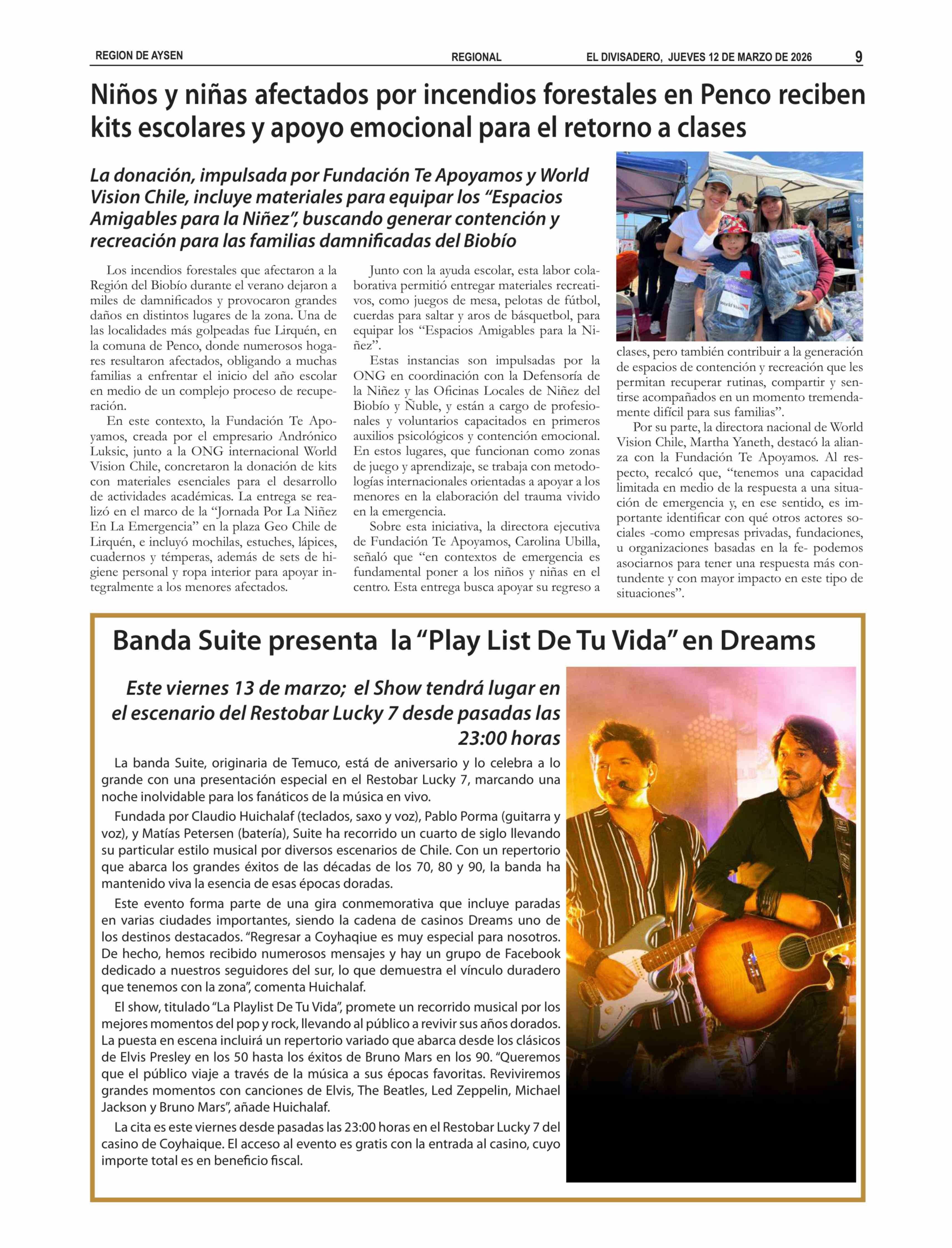 Niños y niñas afectados por incendios forestales en Penco reciben kits escolares y apoyo emocional para el retorno a clases 12-03-2026 El Divisadero |