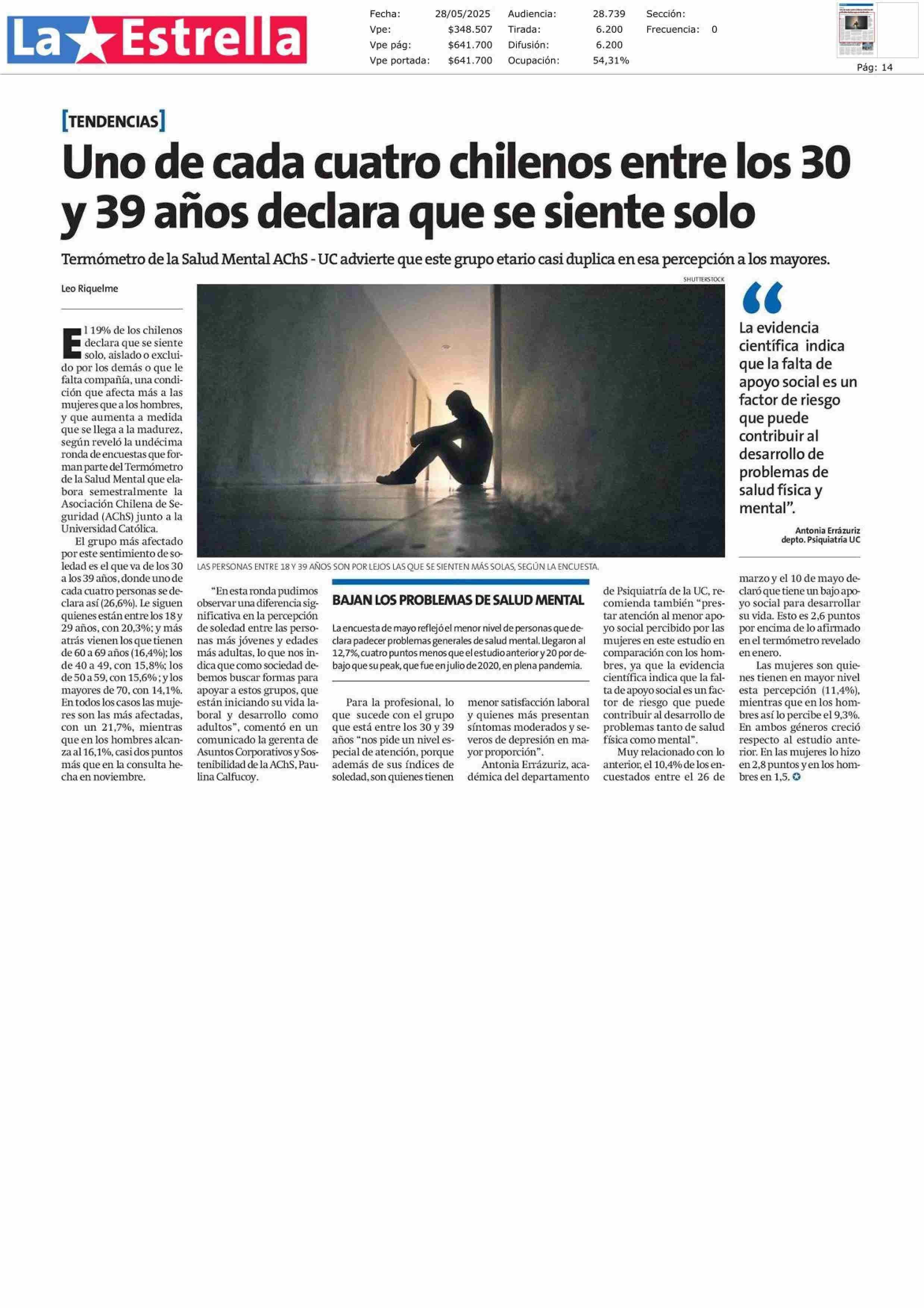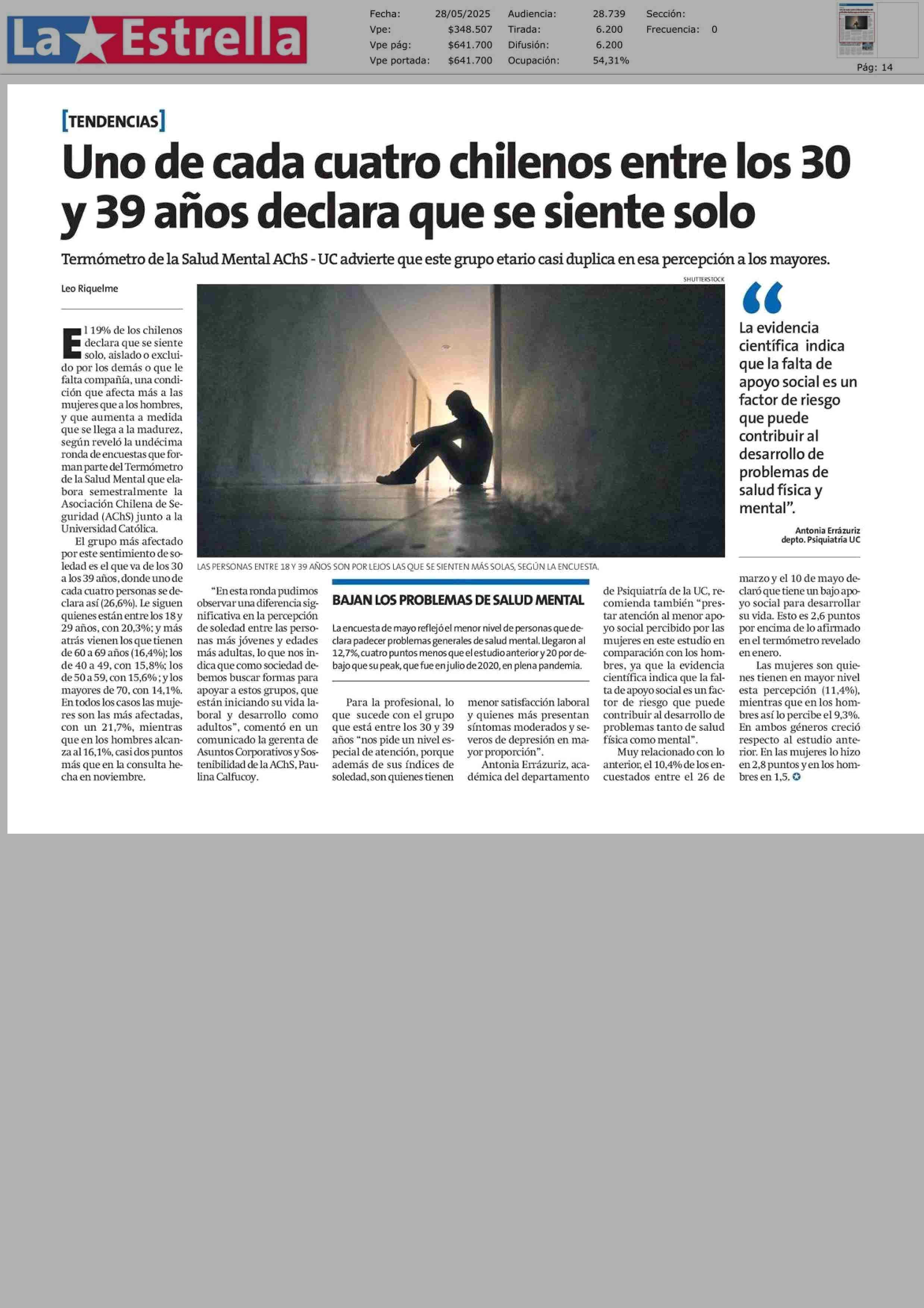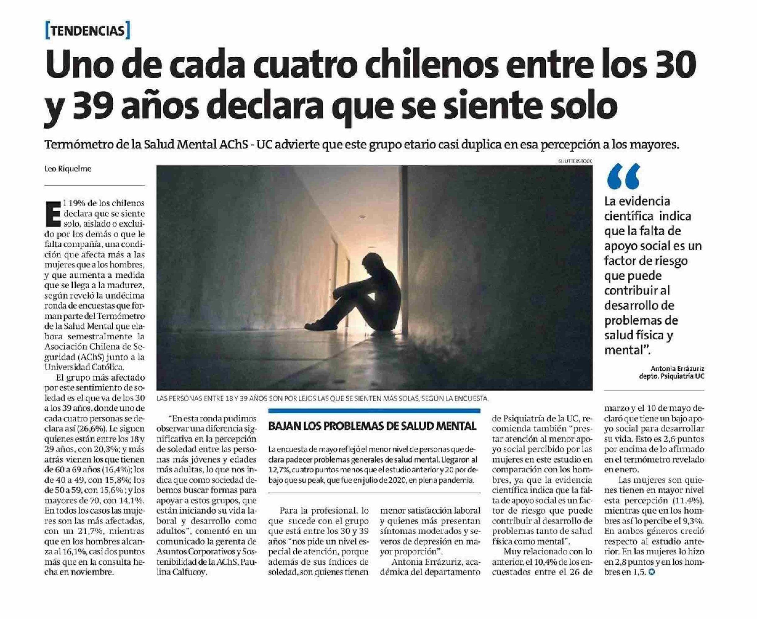 Título: Uno de cada cuatro chilenos entre los 30 y 39 años declara que se siente solo