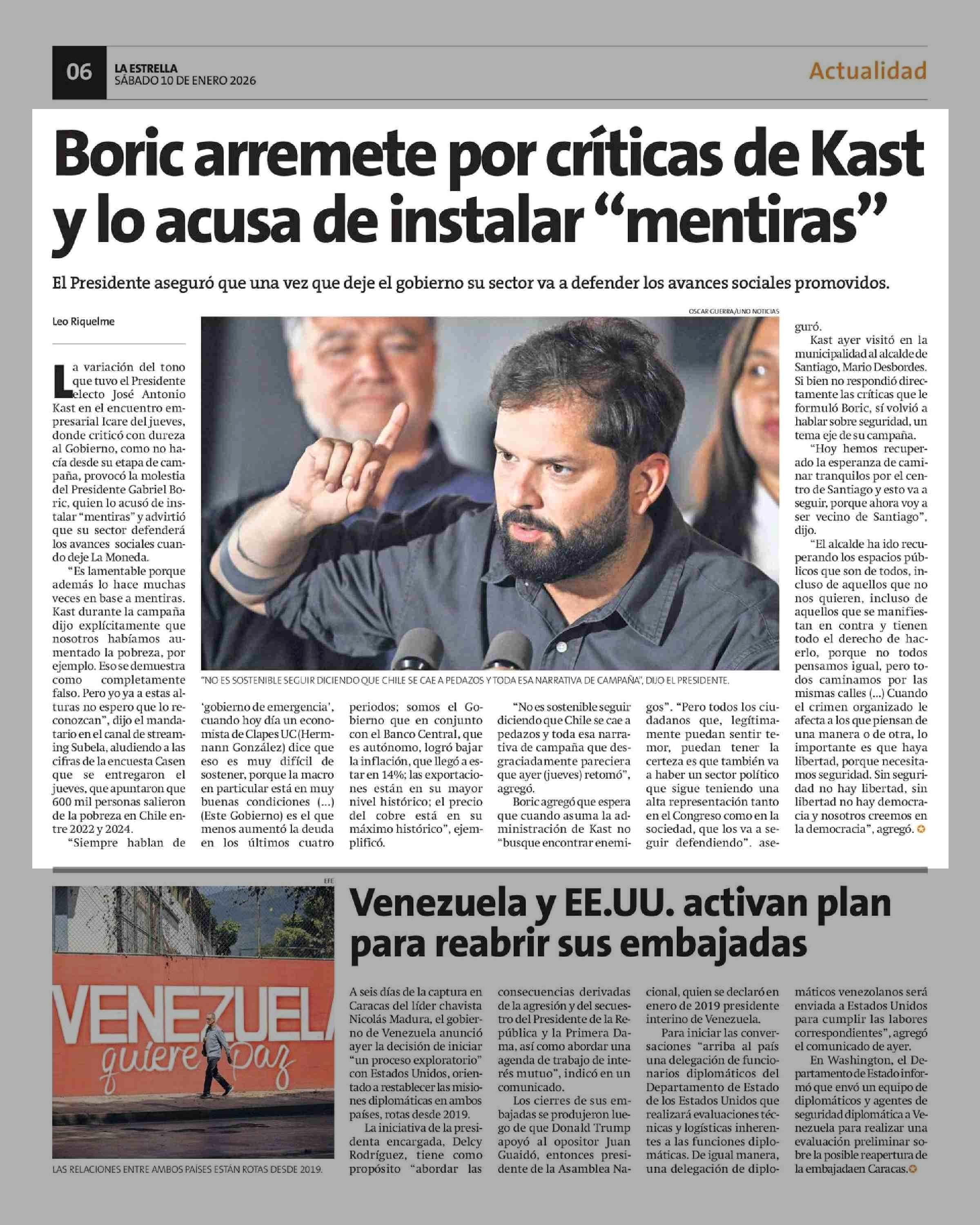 Boric arremete por críticas de Kast y lo acusa de instalar "mentiras" 10-01-2026 La Estrella de Antofagasta |