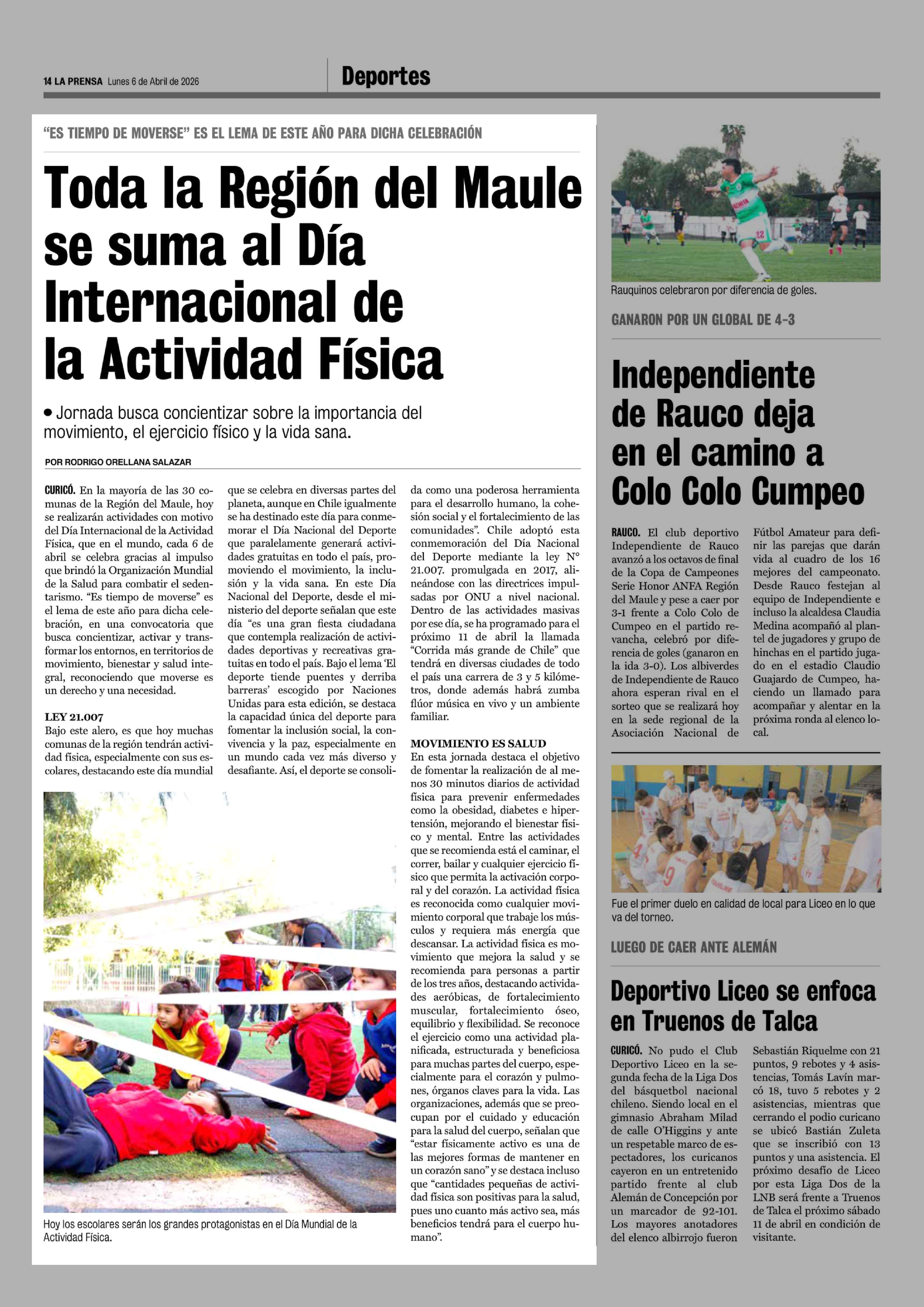 Toda la Región del Maule se suma al Día Internacional de la Actividad Física 06-04-2026 La Prensa de Curicó |