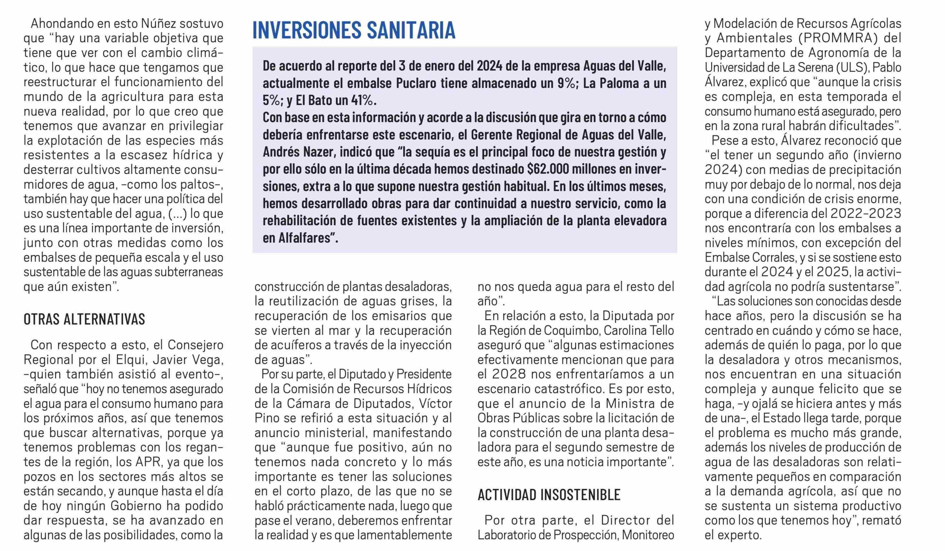 Advierten que al 2028 la zona podría quedarse sin agua para el consumo humano 08-01-2024 El Día |