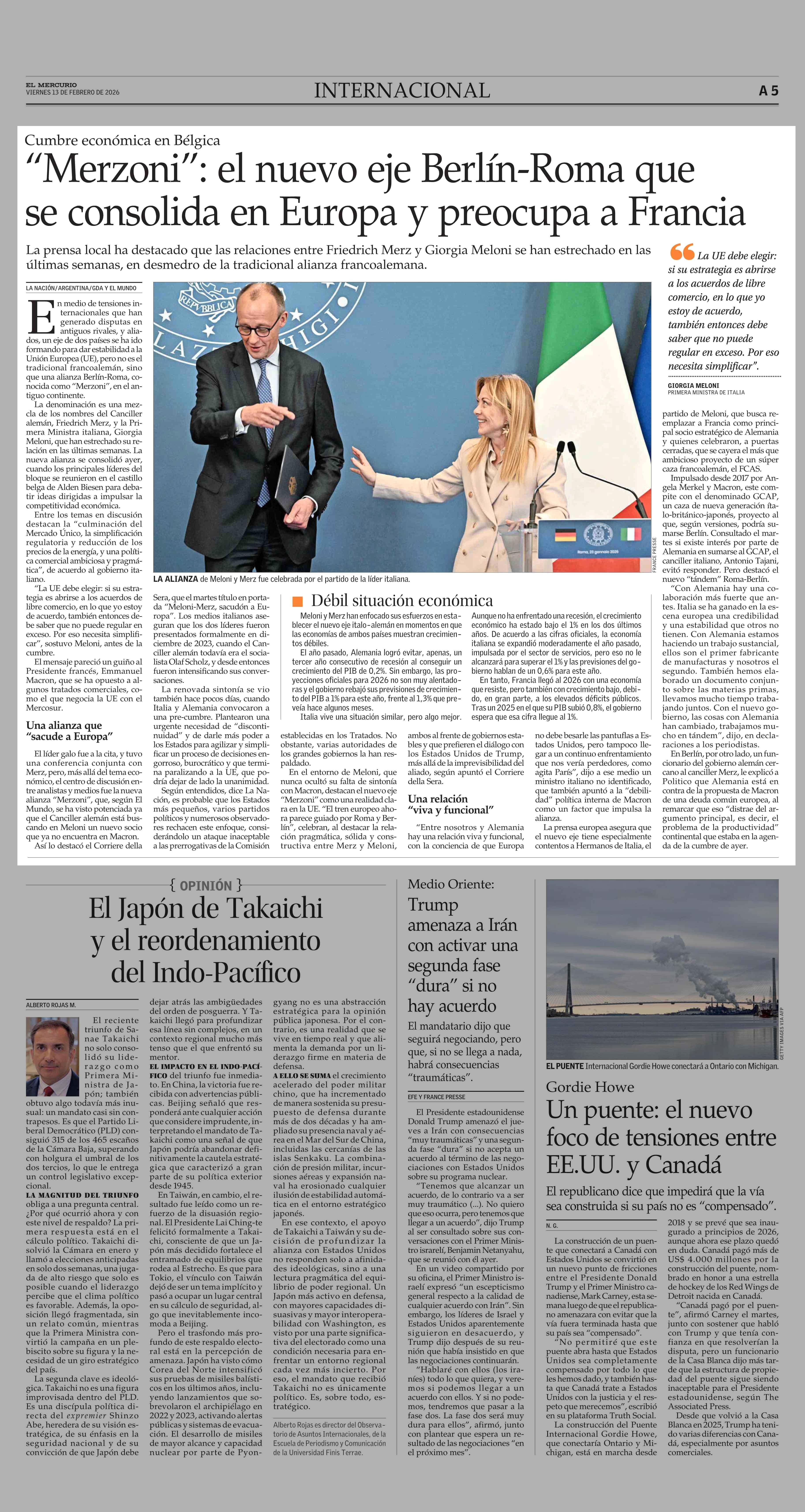 “Merzoni”: el nuevo eje Berlín-Roma que se consolida en Europa y preocupa a Francia 13-02-2026 El Mercurio |