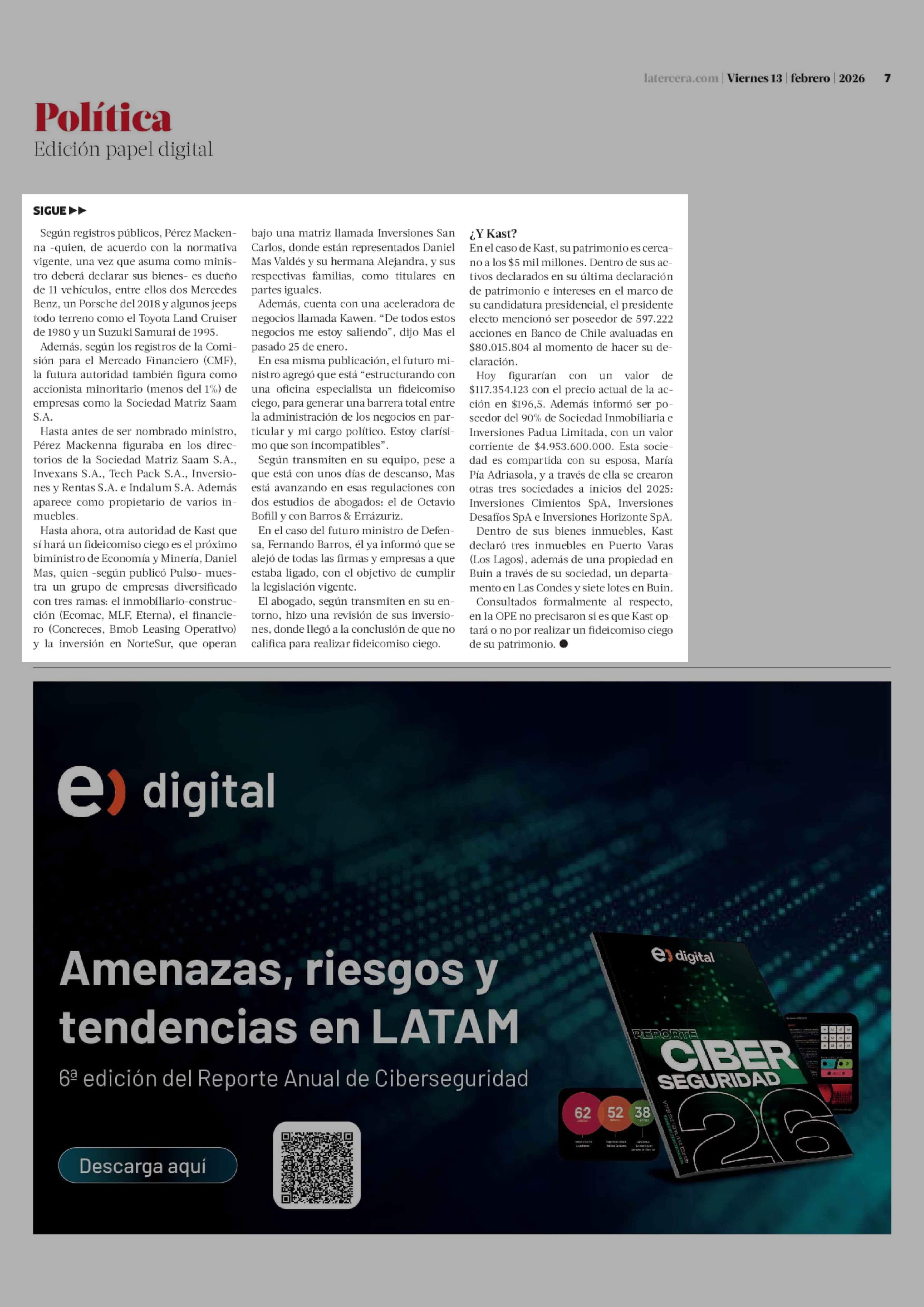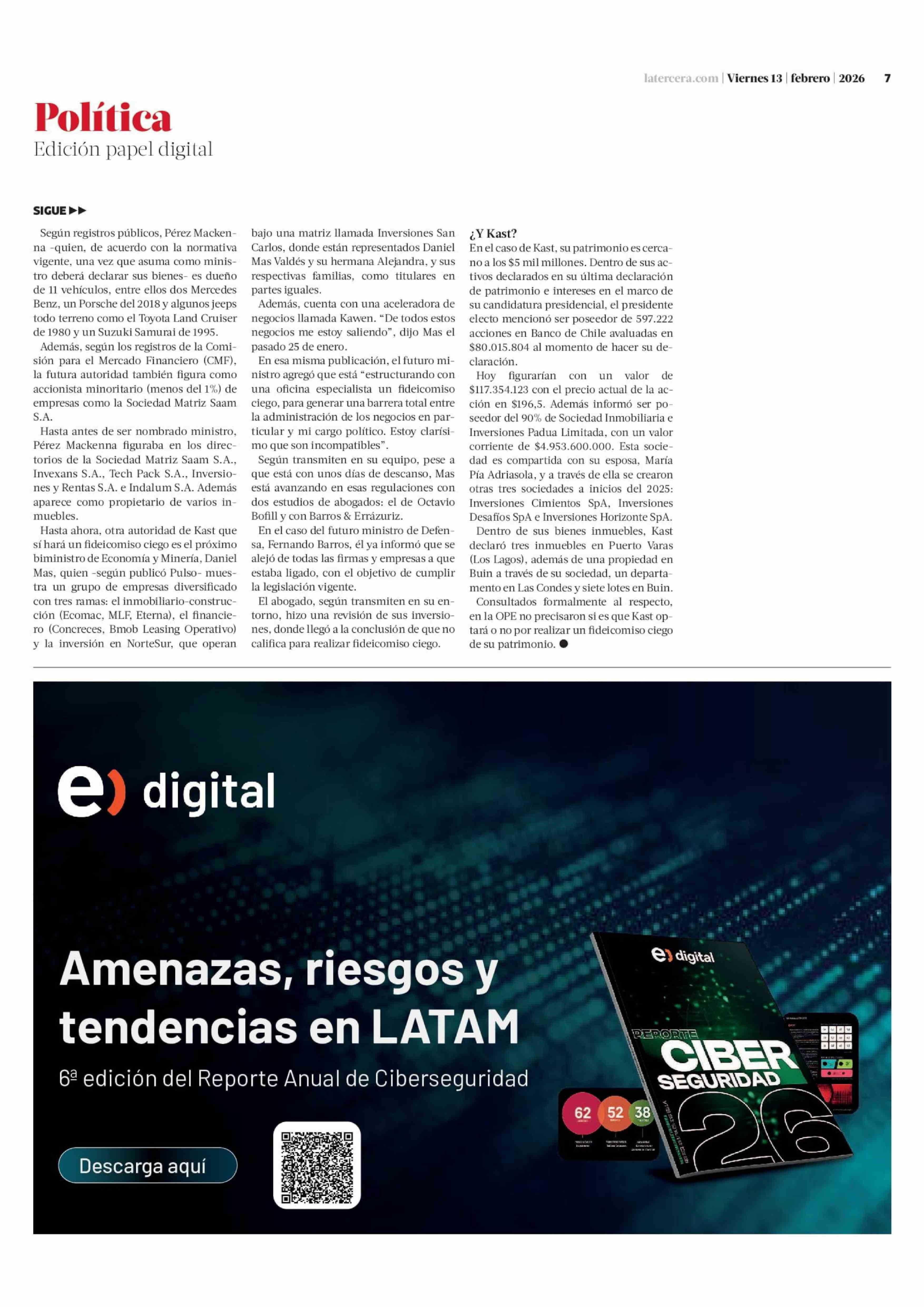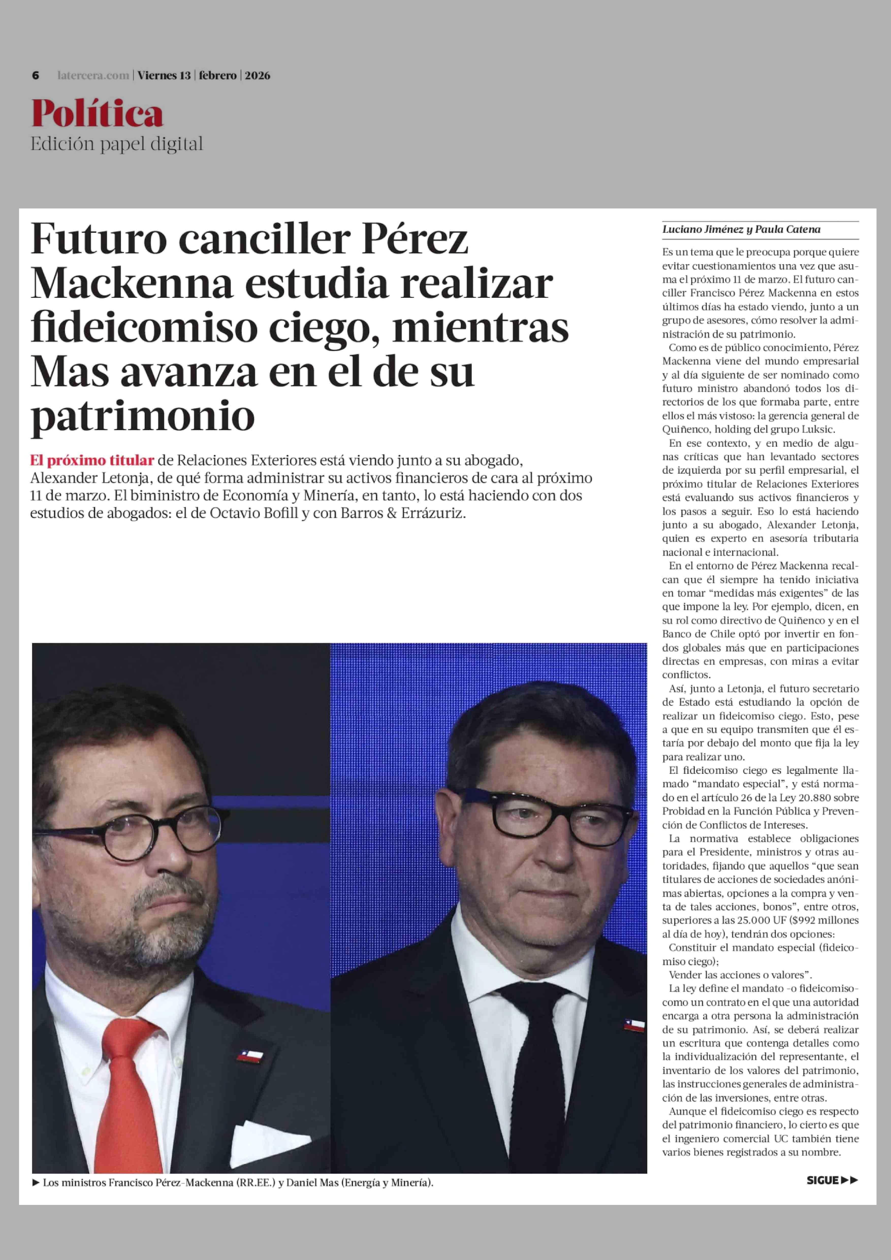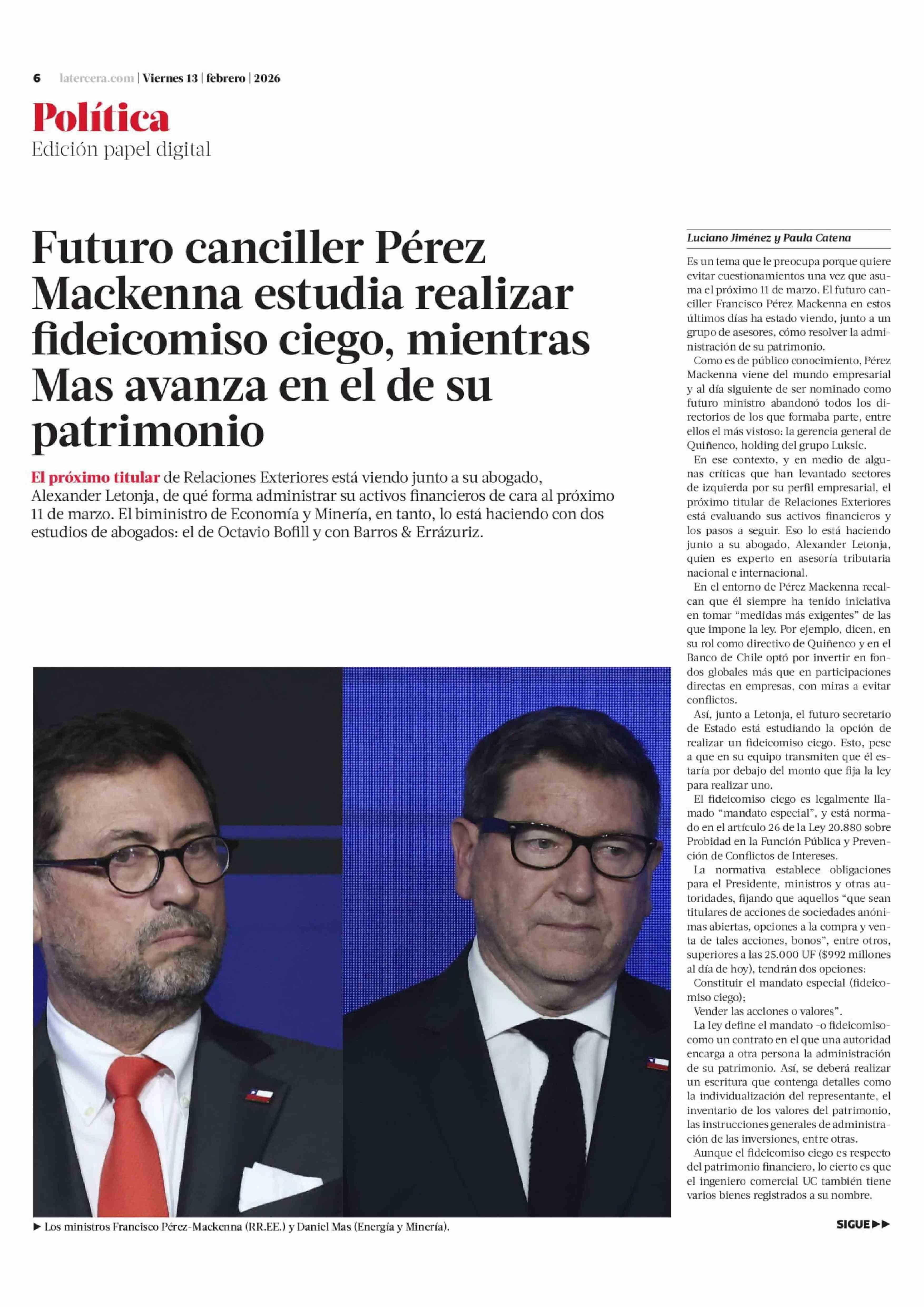 Futuro canciller Pérez Mackenna estudia realizar fideicomiso ciego, mientras Mas avanza en el de su patrimonio 13-02-2026 La Tercera |