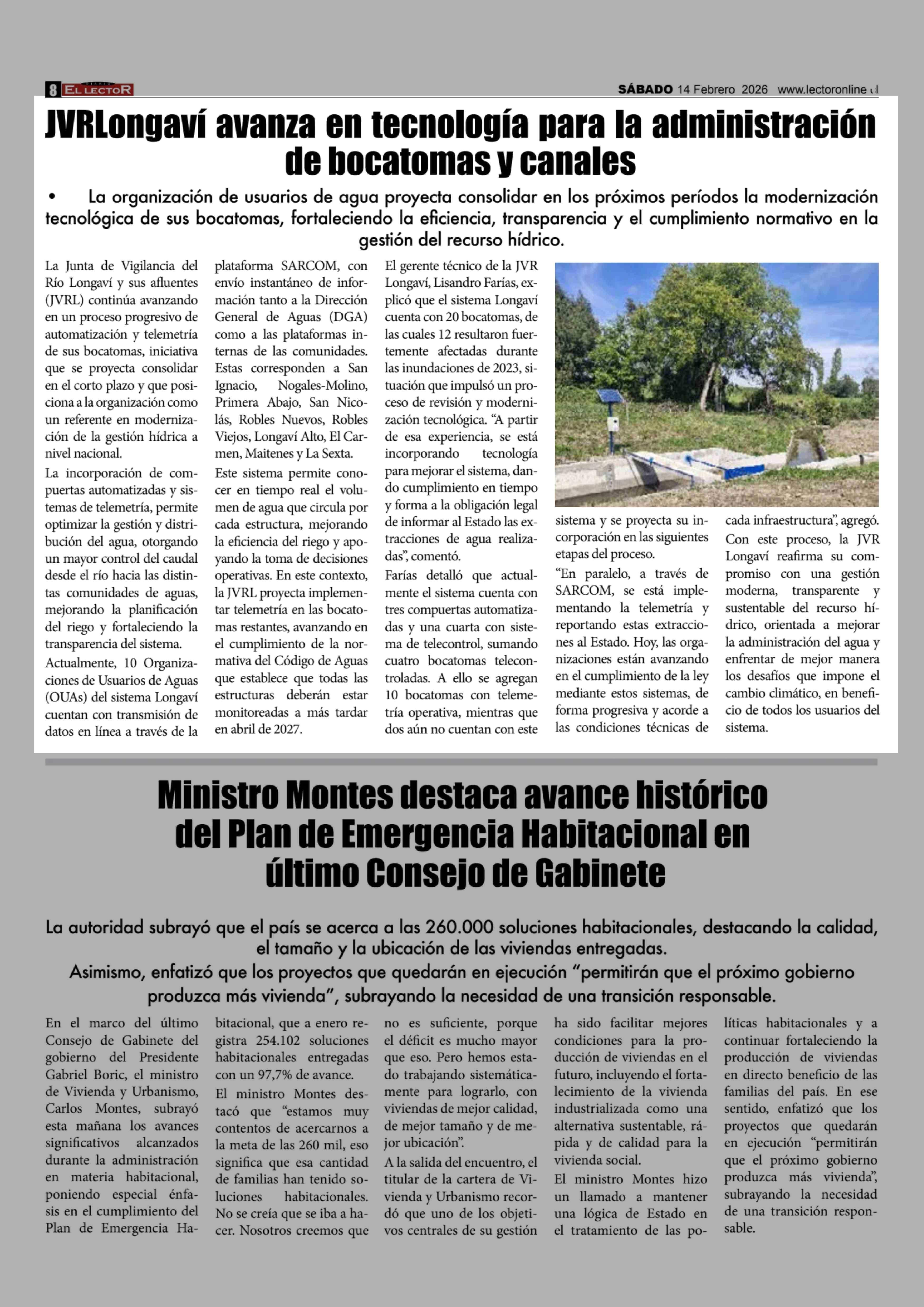 JVRLongaví avanza en tecnología para la administración de bocatomas y canales 14-02-2026 El Lector |