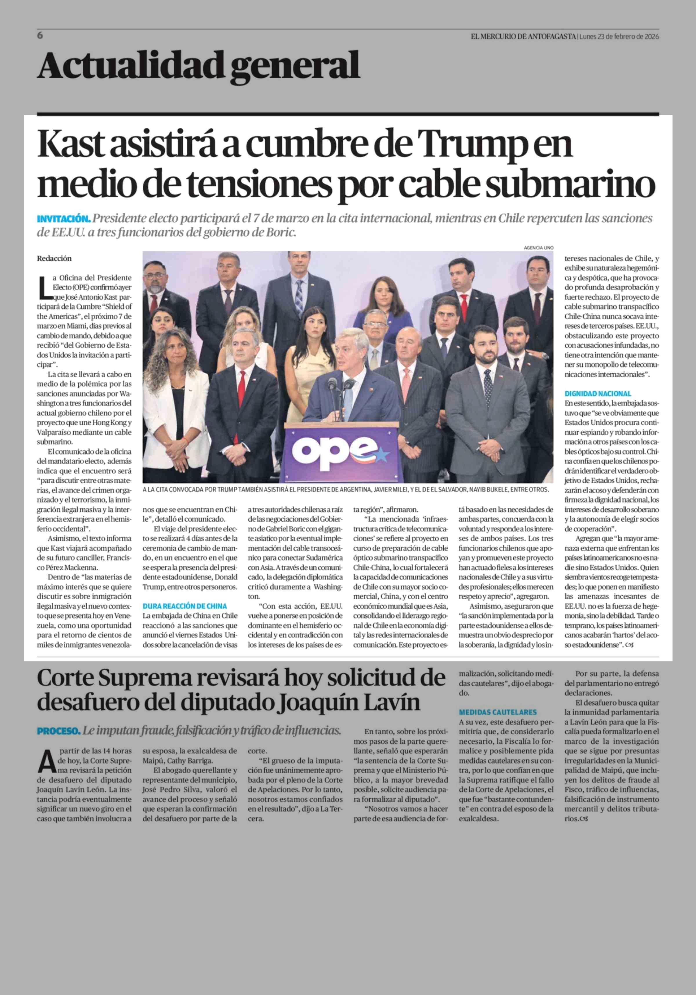 Kast asistirá a cumbre de Trump en medio de tensiones por cable submarino 23-02-2026 El Mercurio de Antofagasta |
