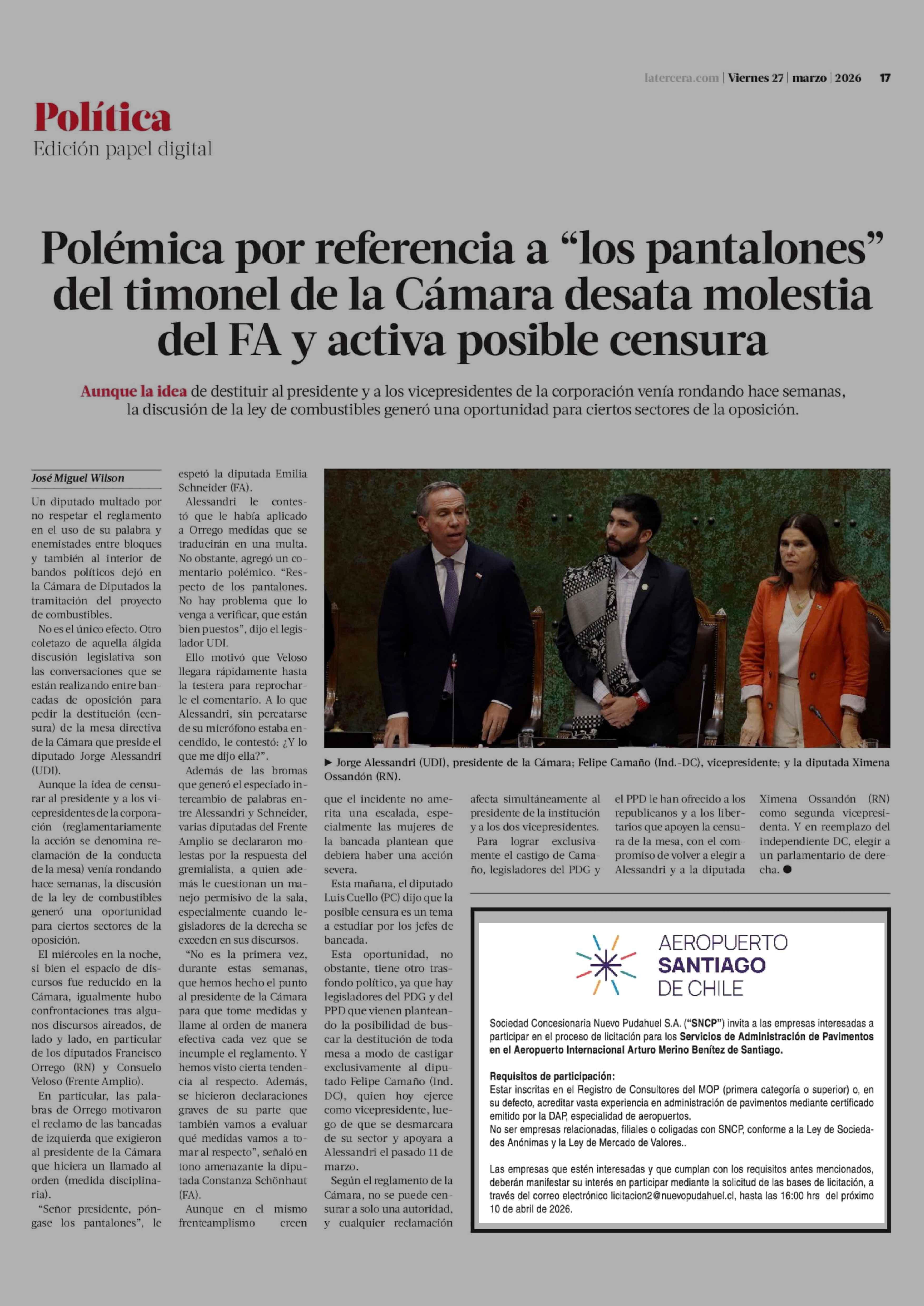 Aviso Licitaciones: AEROPUERTO SANTIAGO DE CHILE 27-03-2026 La Tercera |