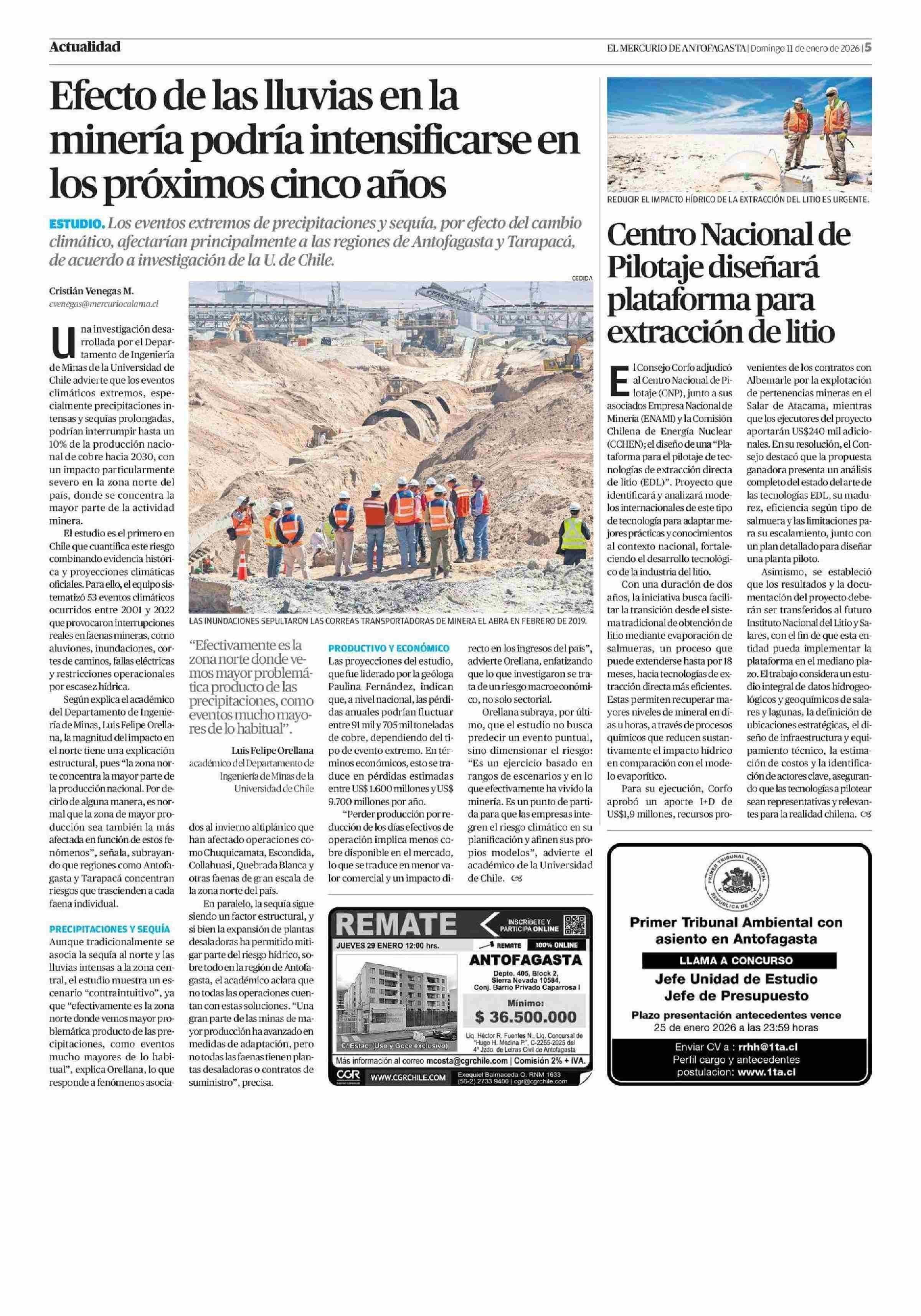 Centro Nacional de Pilotaje diseñará plataforma para extracción de litio 11-01-2026 El Mercurio de Antofagasta |