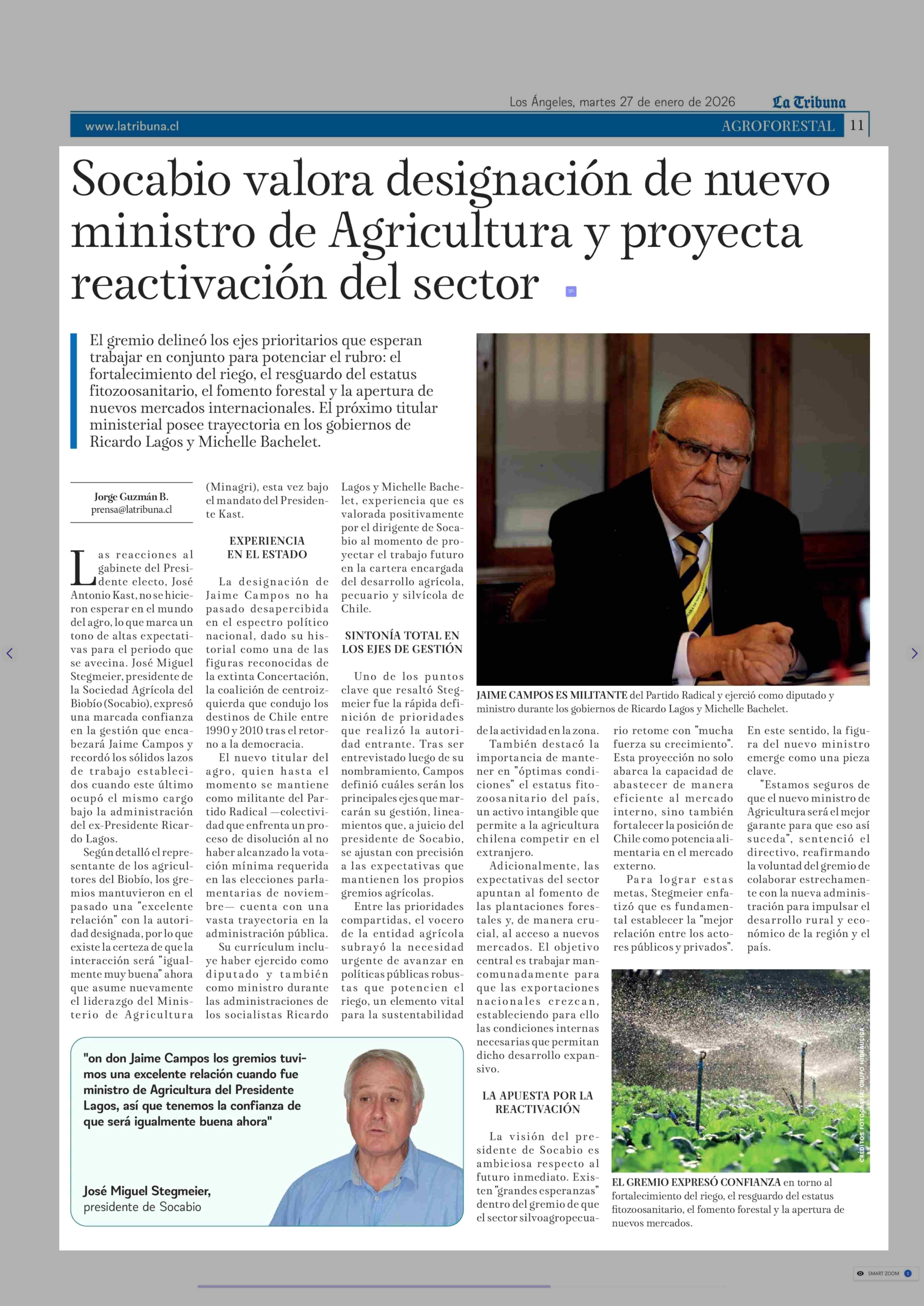 | Título: | Socabio valora designación de nuevo ministro de Agricultura y proyecta reactivación del sector |