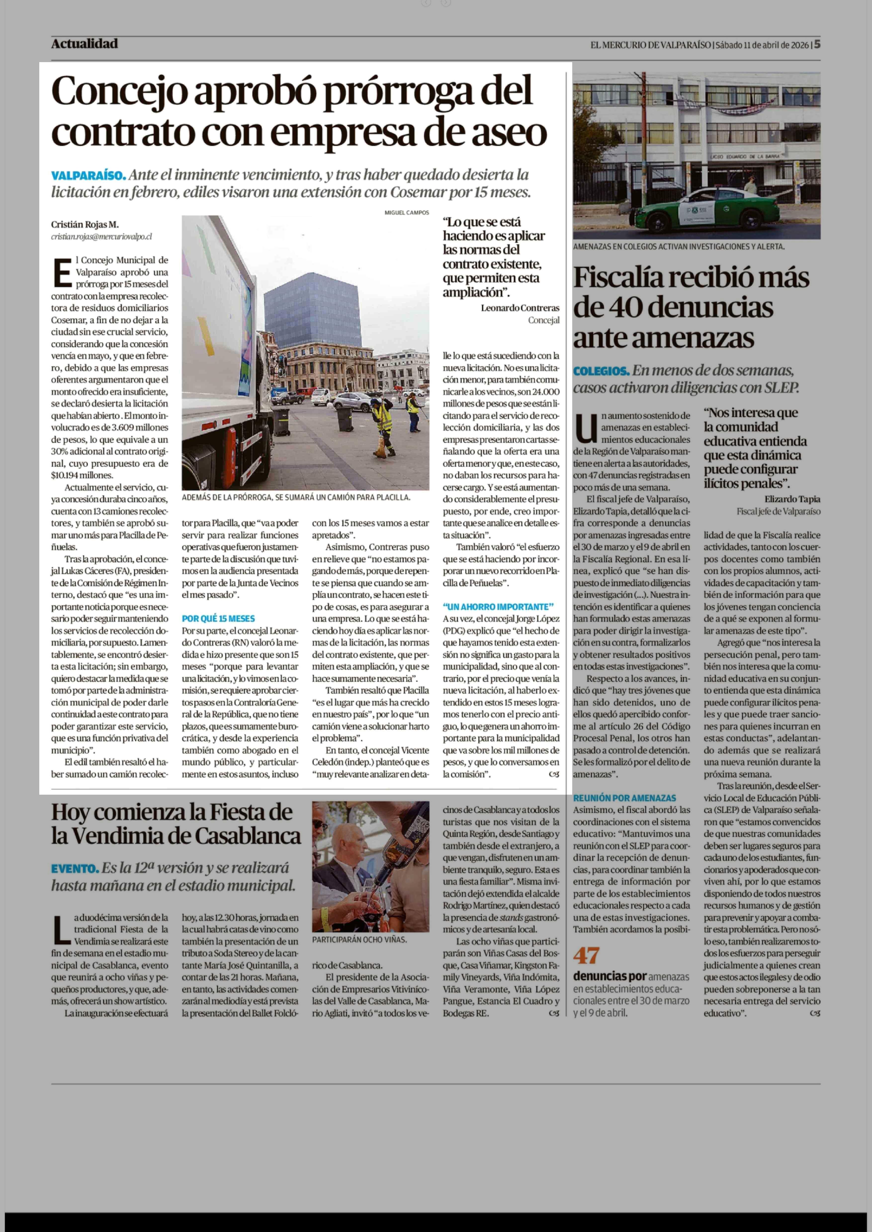 Concejo aprobó prórroga del contrato con empresa de aseo 11-04-2026 El Mercurio de Valparaíso |