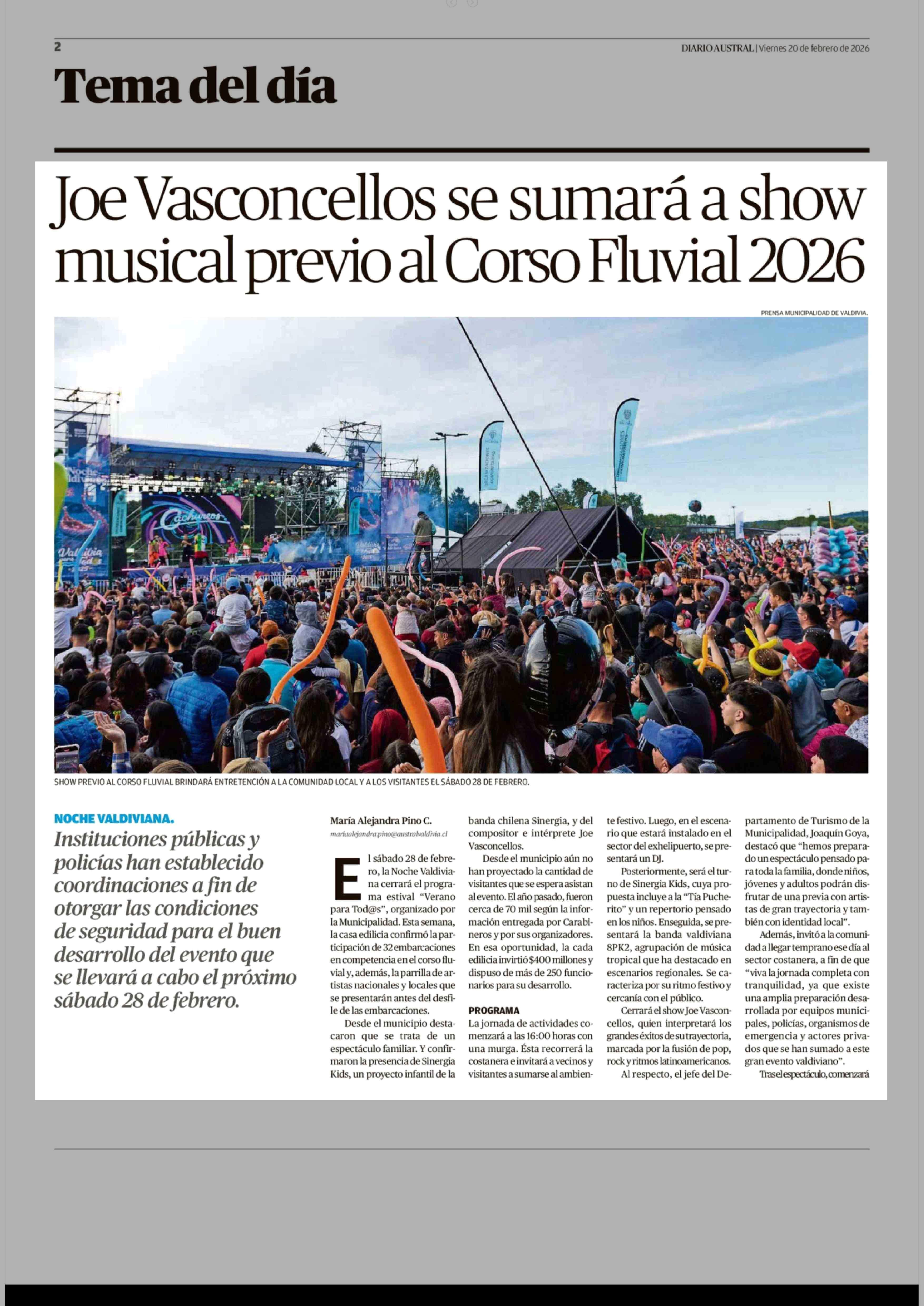 Título: Joe Vasconcellos se sumará a show musical previo al Corso Fluvial 2026
