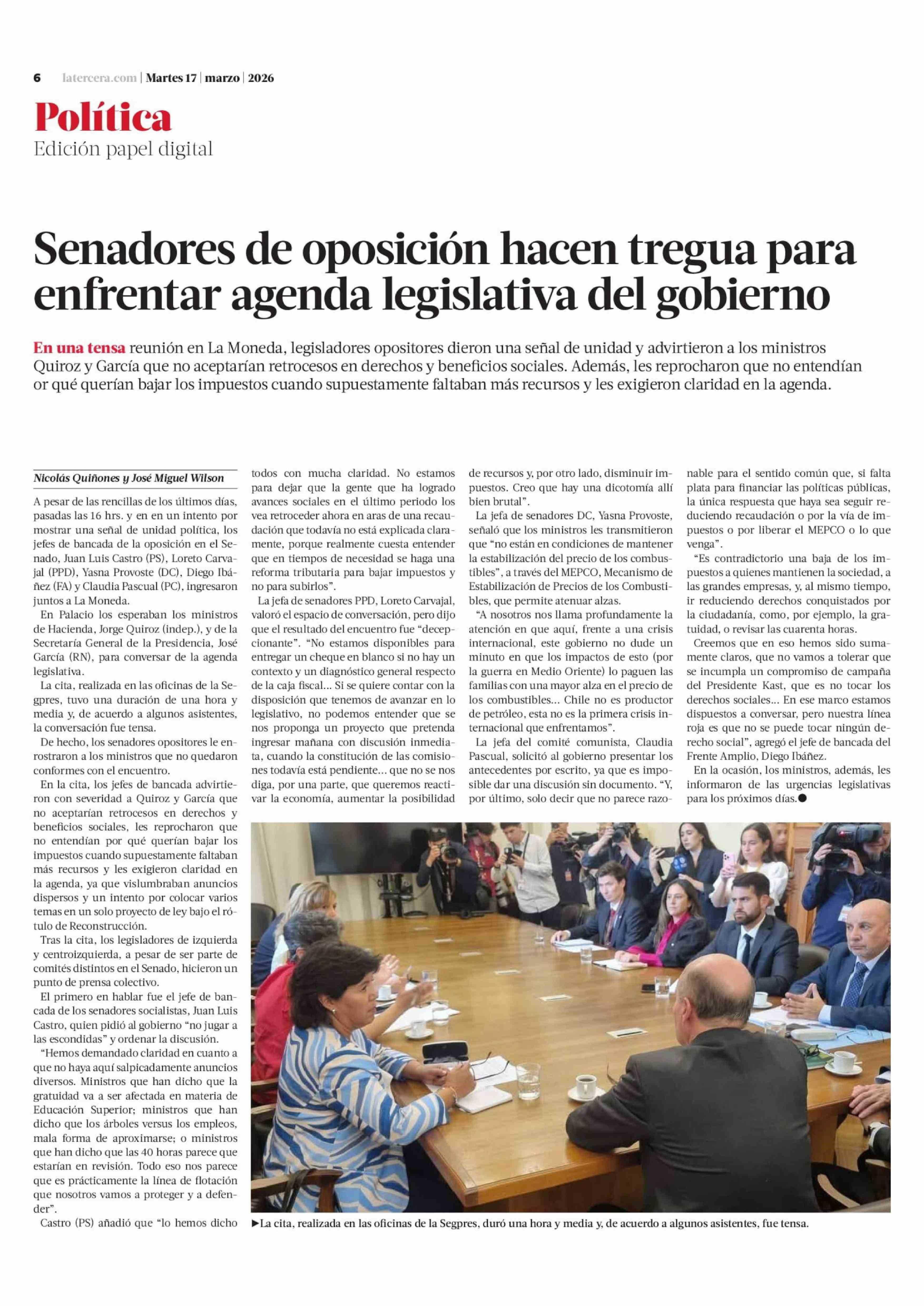 Senadores de oposición hacen tregua para enfrentar agenda legislativa del gobierno 17-03-2026 La Tercera |