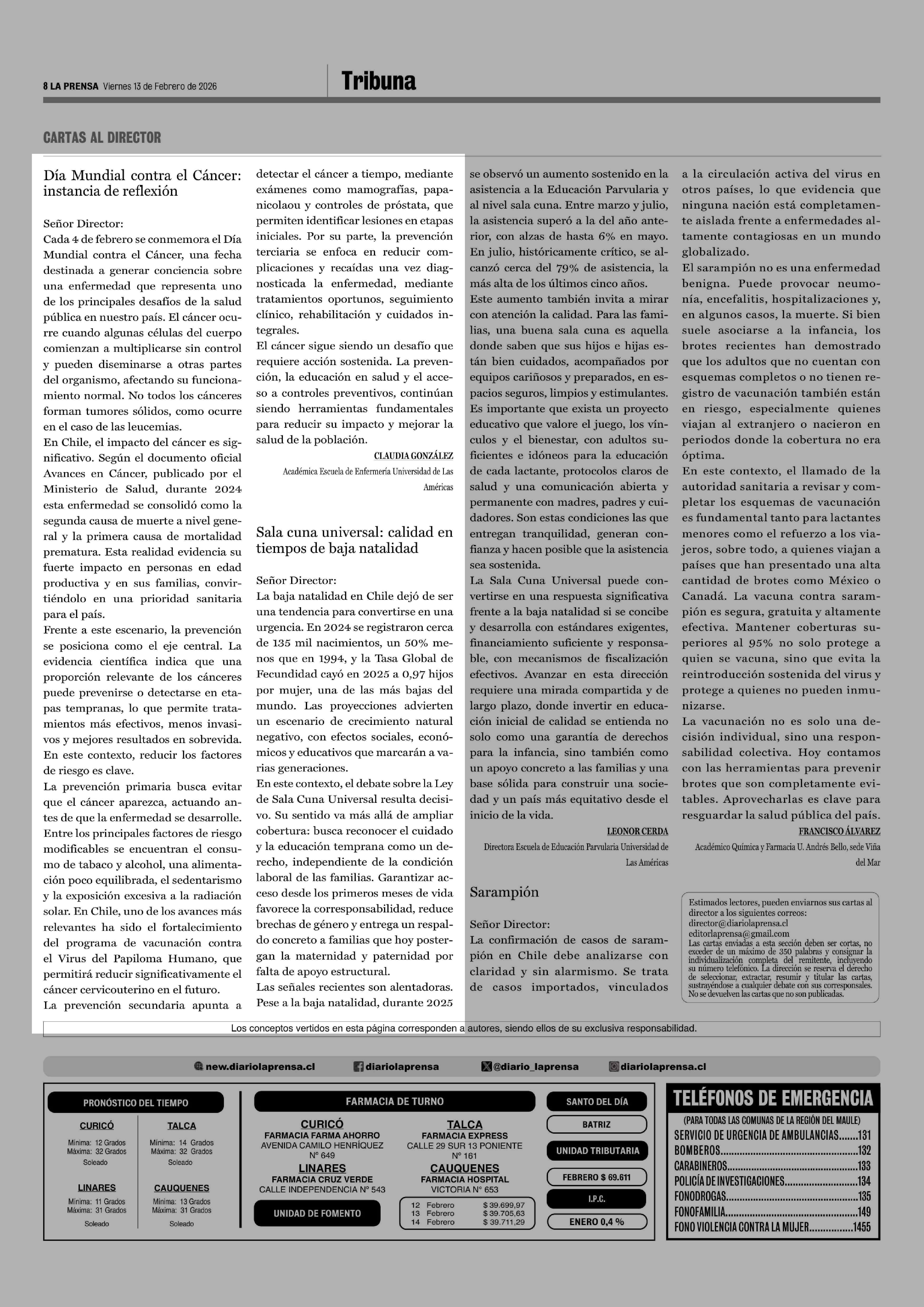 Cartas: Día Mundial contra el Cáncer: instancia de reflexión 13-02-2026 La Prensa de Curicó |