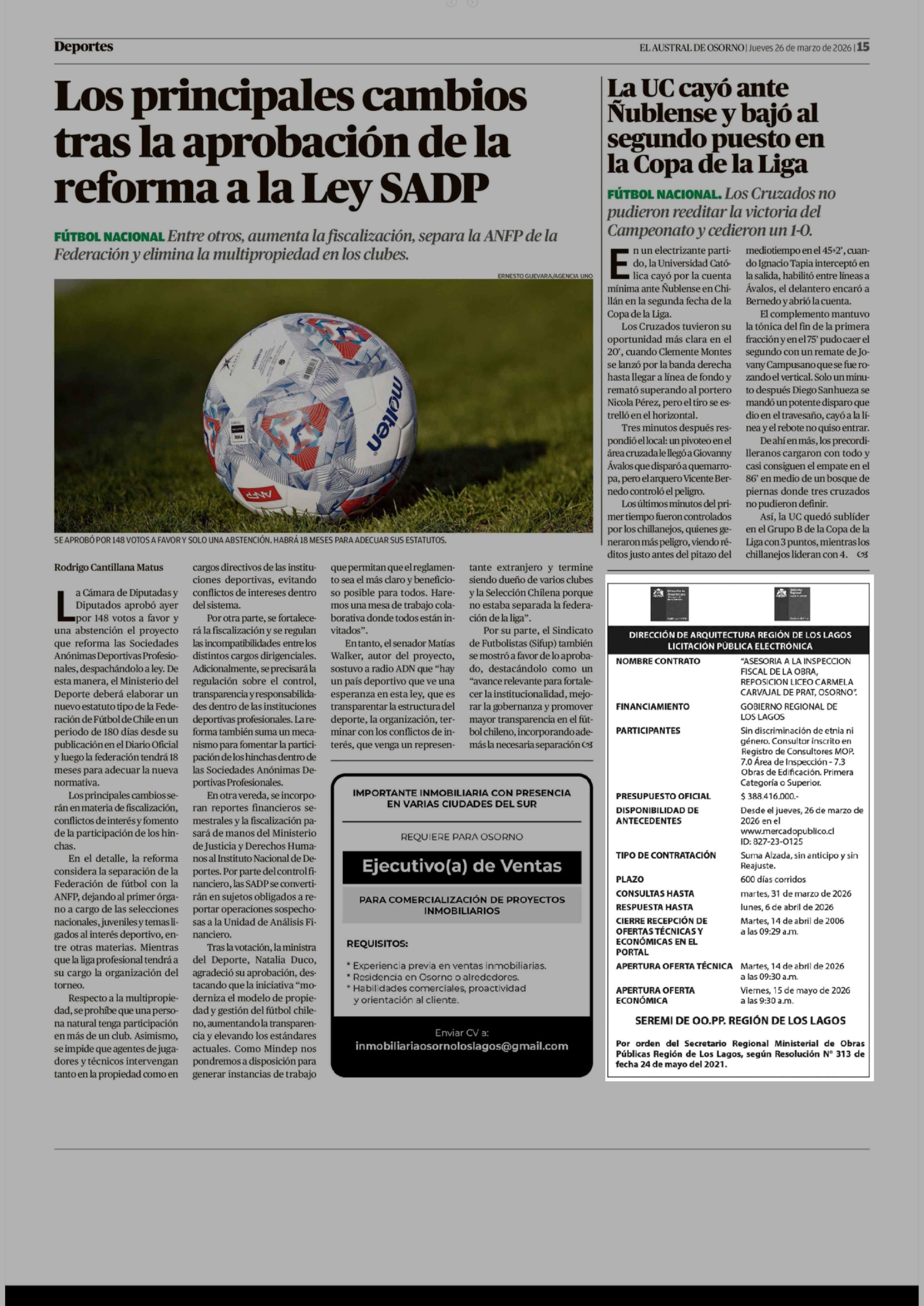 Aviso Licitaciones: DIRECCIÓN DE ARQUITECTURA REGIÓN DE LOS LAGOS 26-03-2026 El Austral de Osorno |