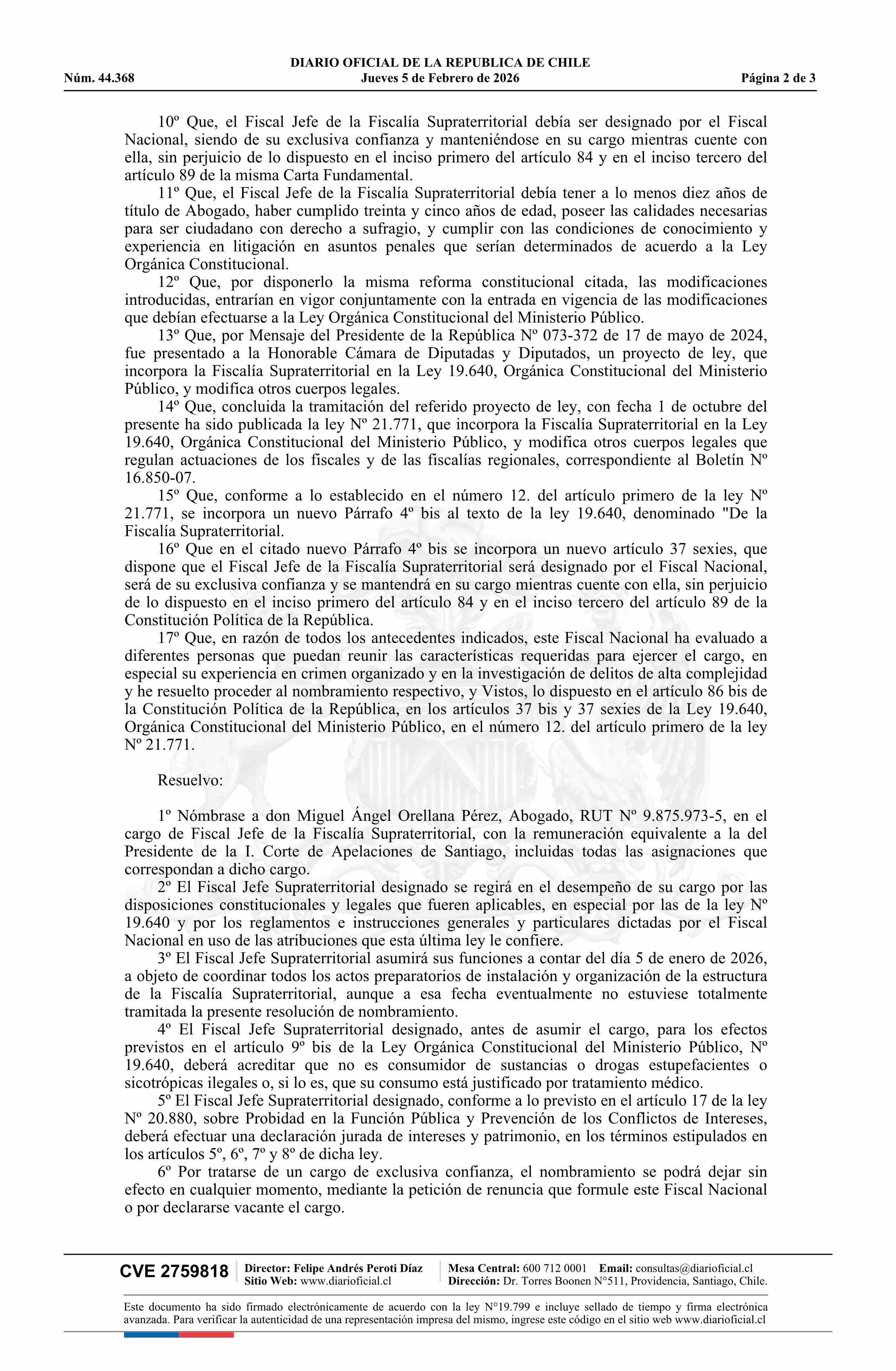Resolución número TR 3, de 2025.- Nombra a don Miguel Ángel Orellana Pérez en el cargo de Fiscal Jefe de la Fiscalía Supraterritorial 05-02-2026 Diario Oficial Edición Electrónica |