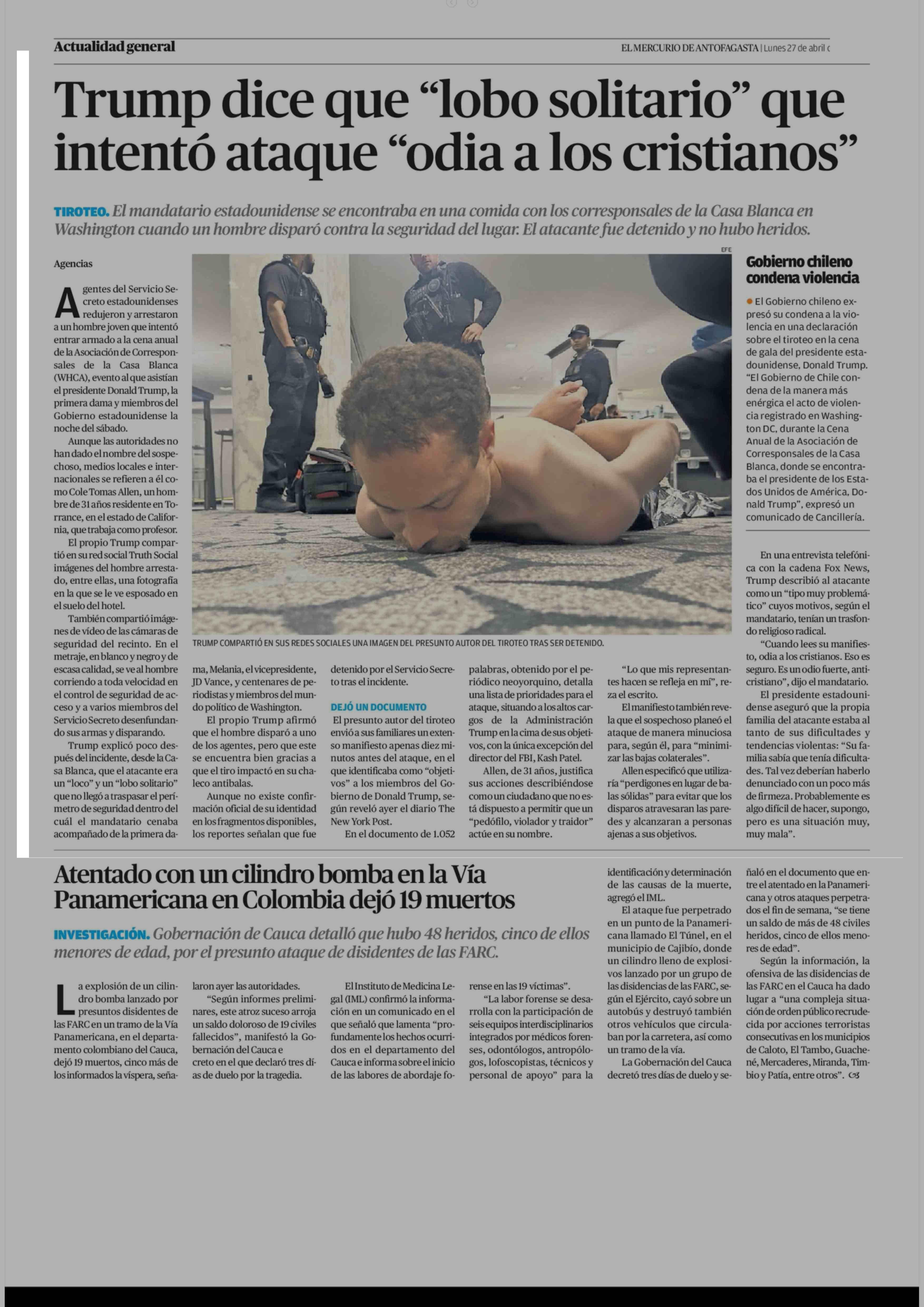 Trump dice que “lobo solitario” que intentó ataque “odia a los cristianos” 27-04-2026 El Mercurio de Antofagasta |