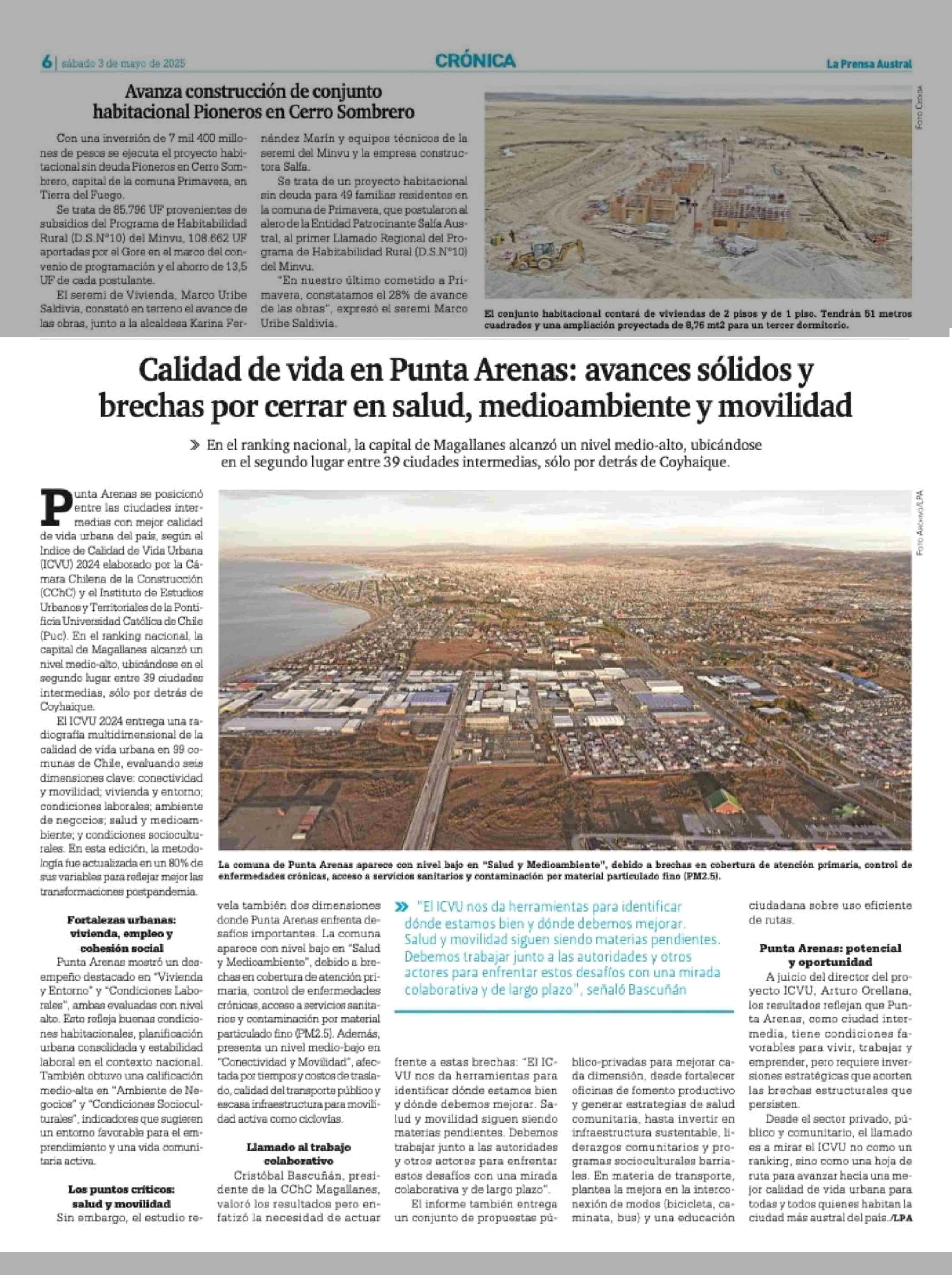 Calidad de vida en Punta Arenas: avances sólidos y brechas por cerrar en salud, medioambiente y movilidad 03-05-2025 La Prensa Austral |