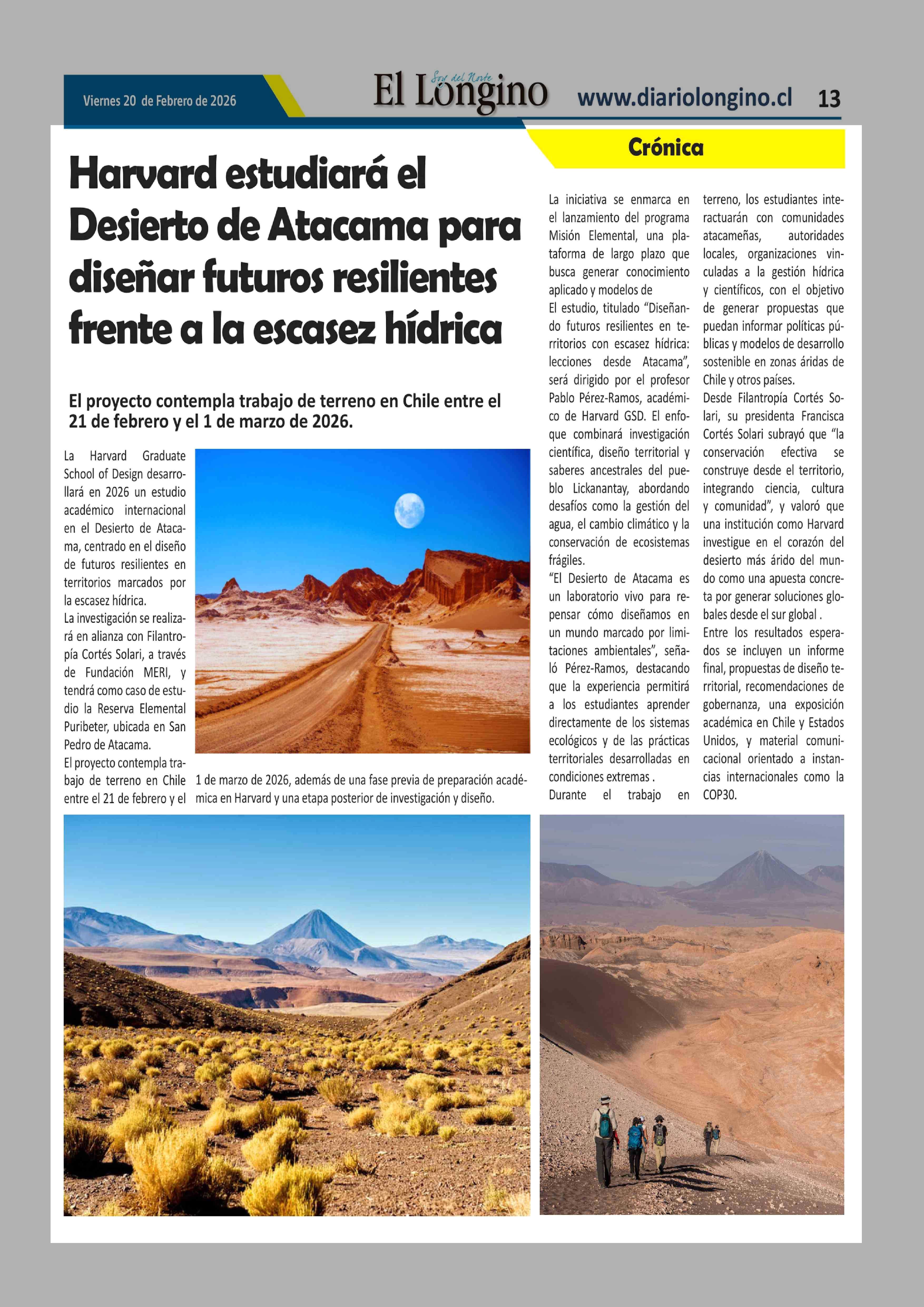 Harvard estudiará el Desierto de Atacama para diseñar futuros resilientes frente a la escasez hídrica 20-02-2026 El Longino |