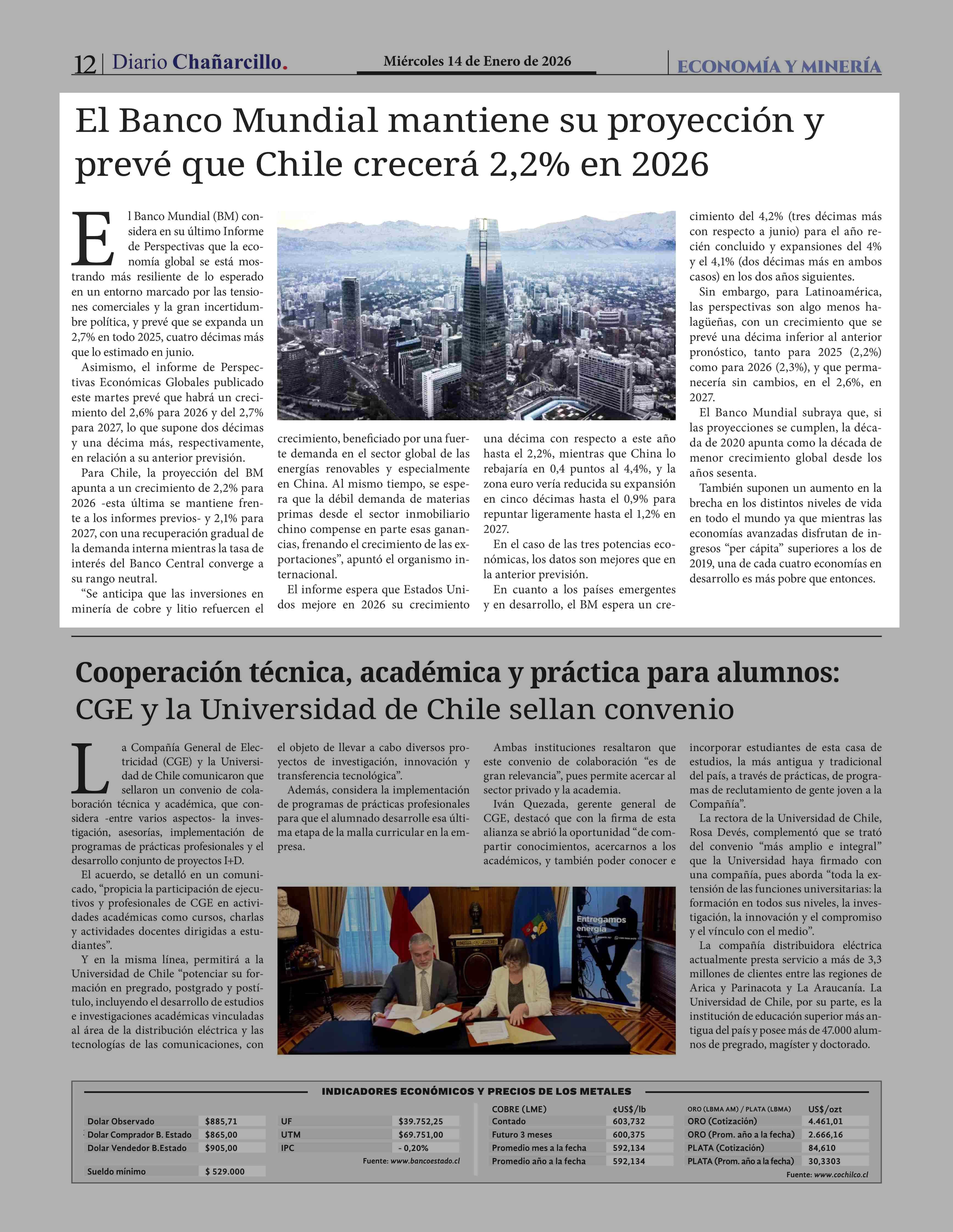 El Banco Mundial mantiene su proyección y prevé que Chile crecerá 2,2% en 2026 14-01-2026 Diario Chañarcillo |