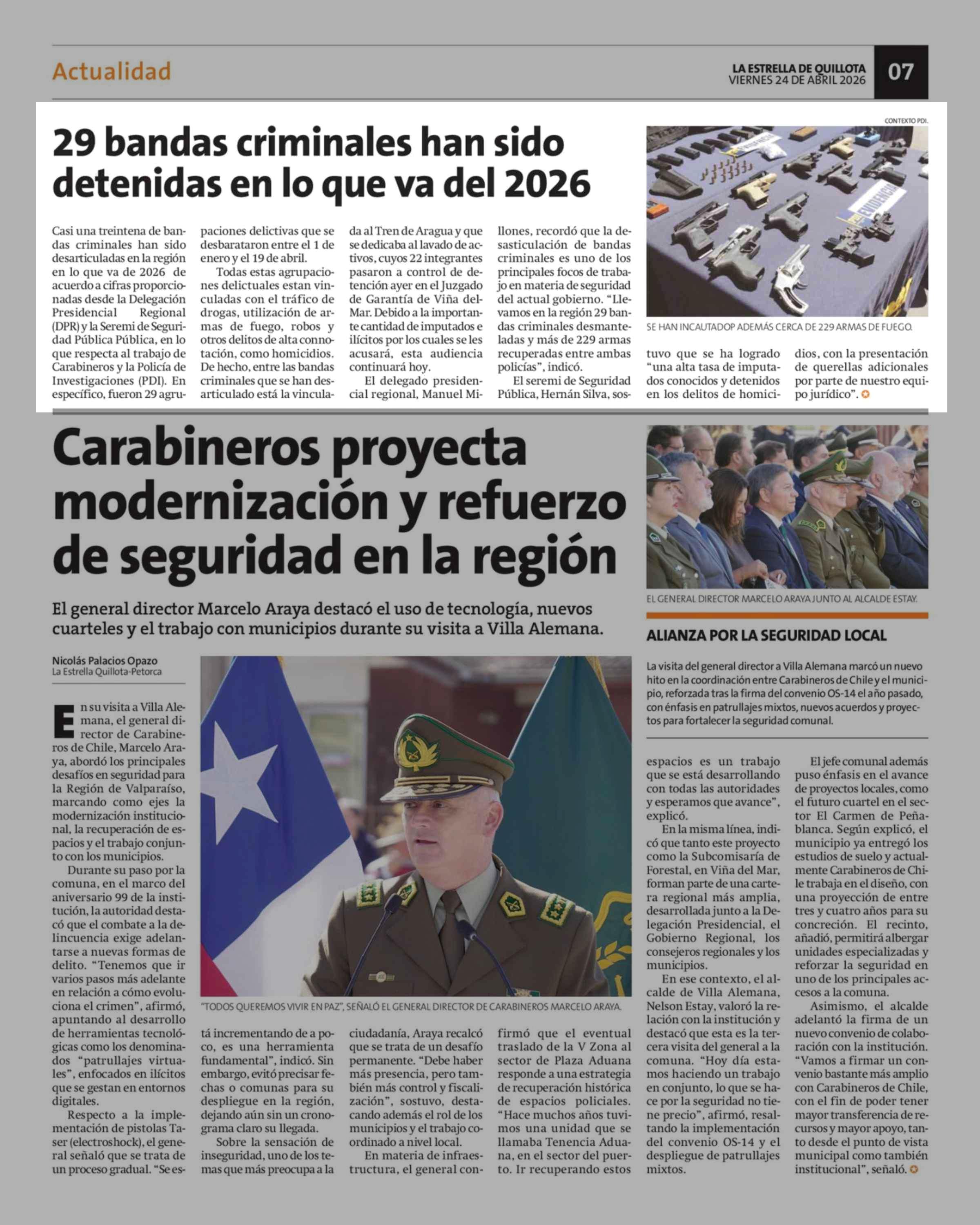 29 Bandas criminales han sido detenidas en lo que va del 2026 24-04-2026 La Estrella de Quillota |