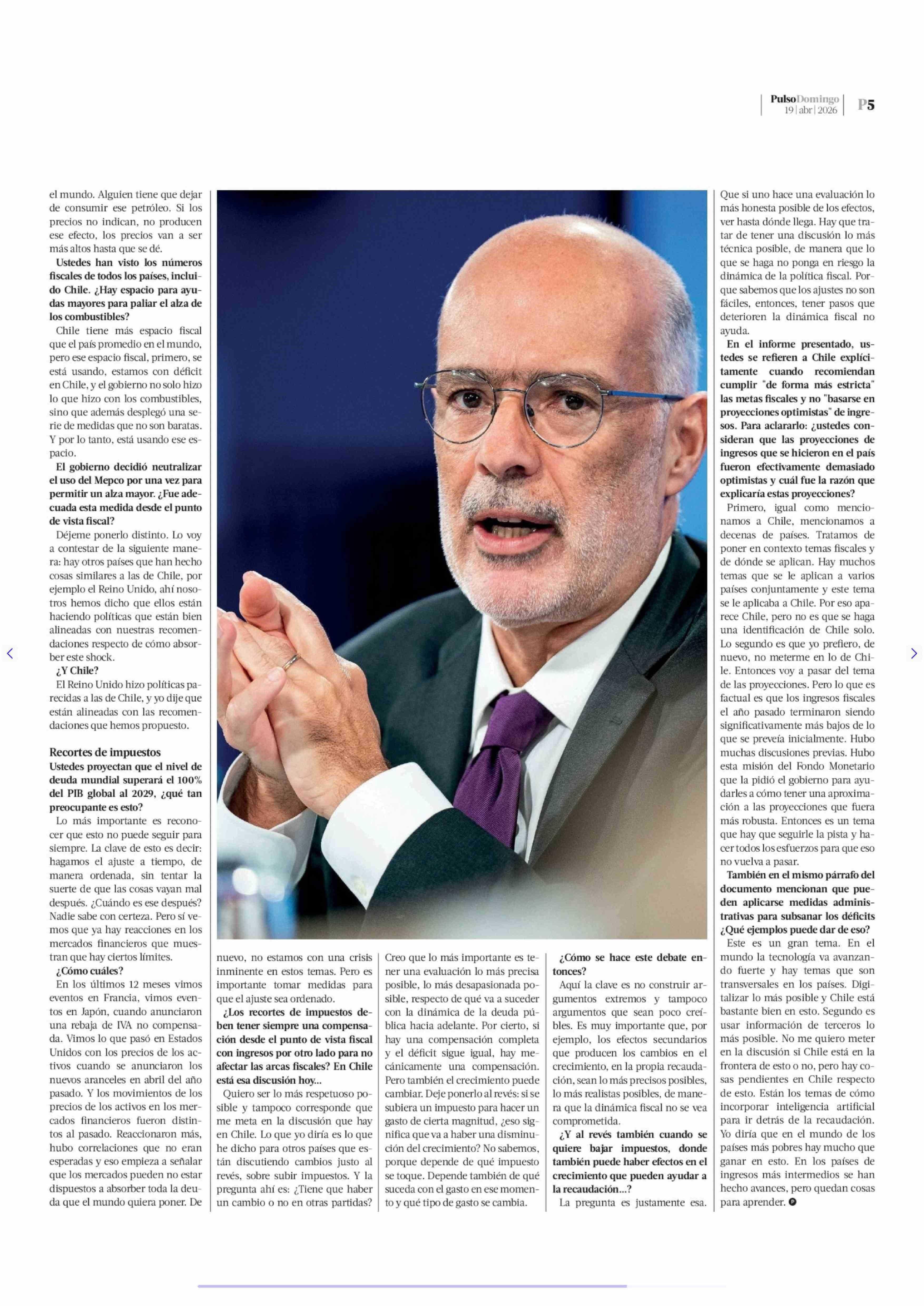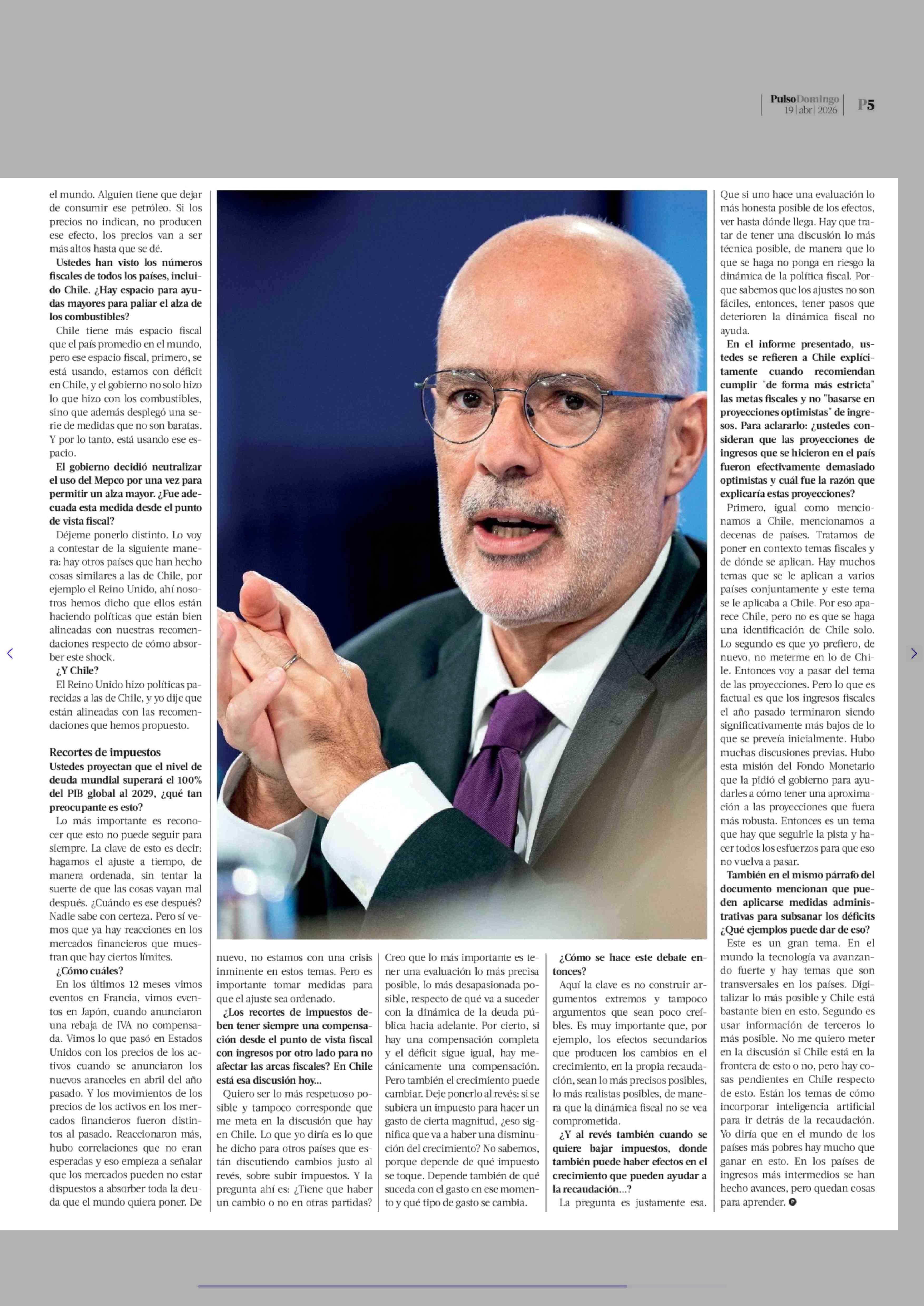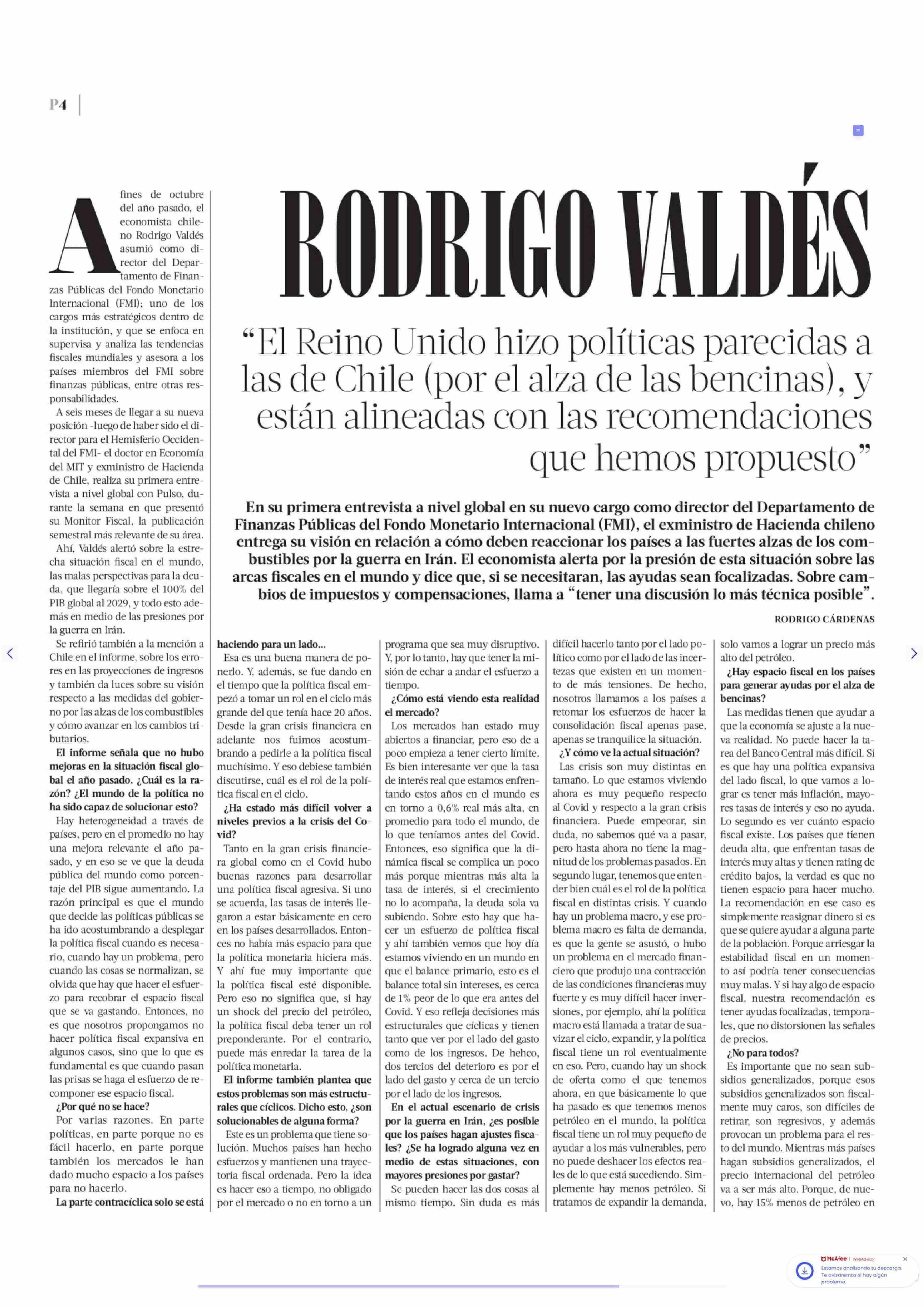RODRIGO VALDÉS "El Reino Unido hizo políticas parecidas a las de Chile (por el alza de las bencinas), y están alineadas con las recomendaciones que hemos propuesto" 19-04-2026 La Tercera |