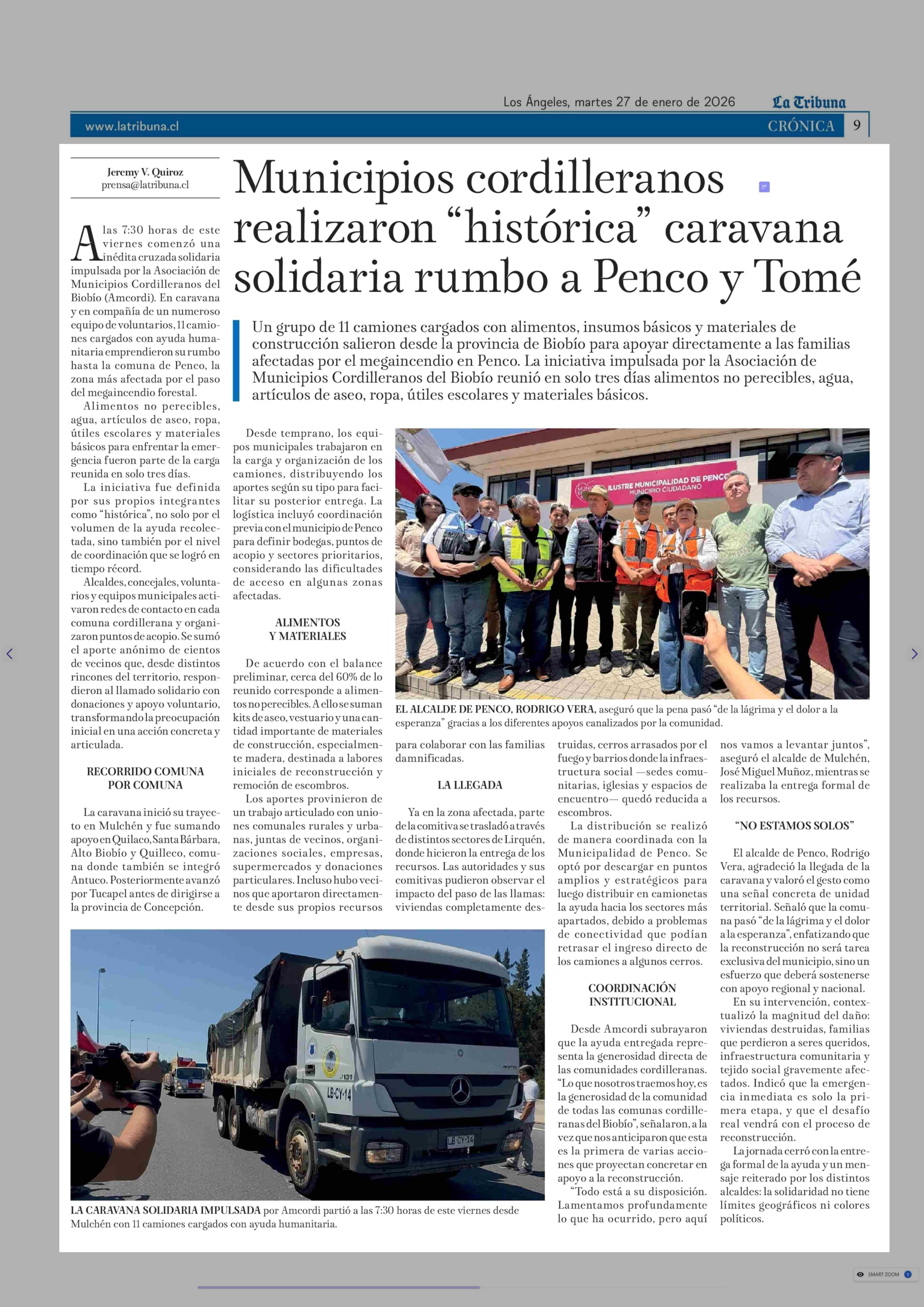 Municipios cordilleranos realizaron "histórica" caravana solidaria rumbo a Penco y Tomé 27-01-2026 La Tribuna |
