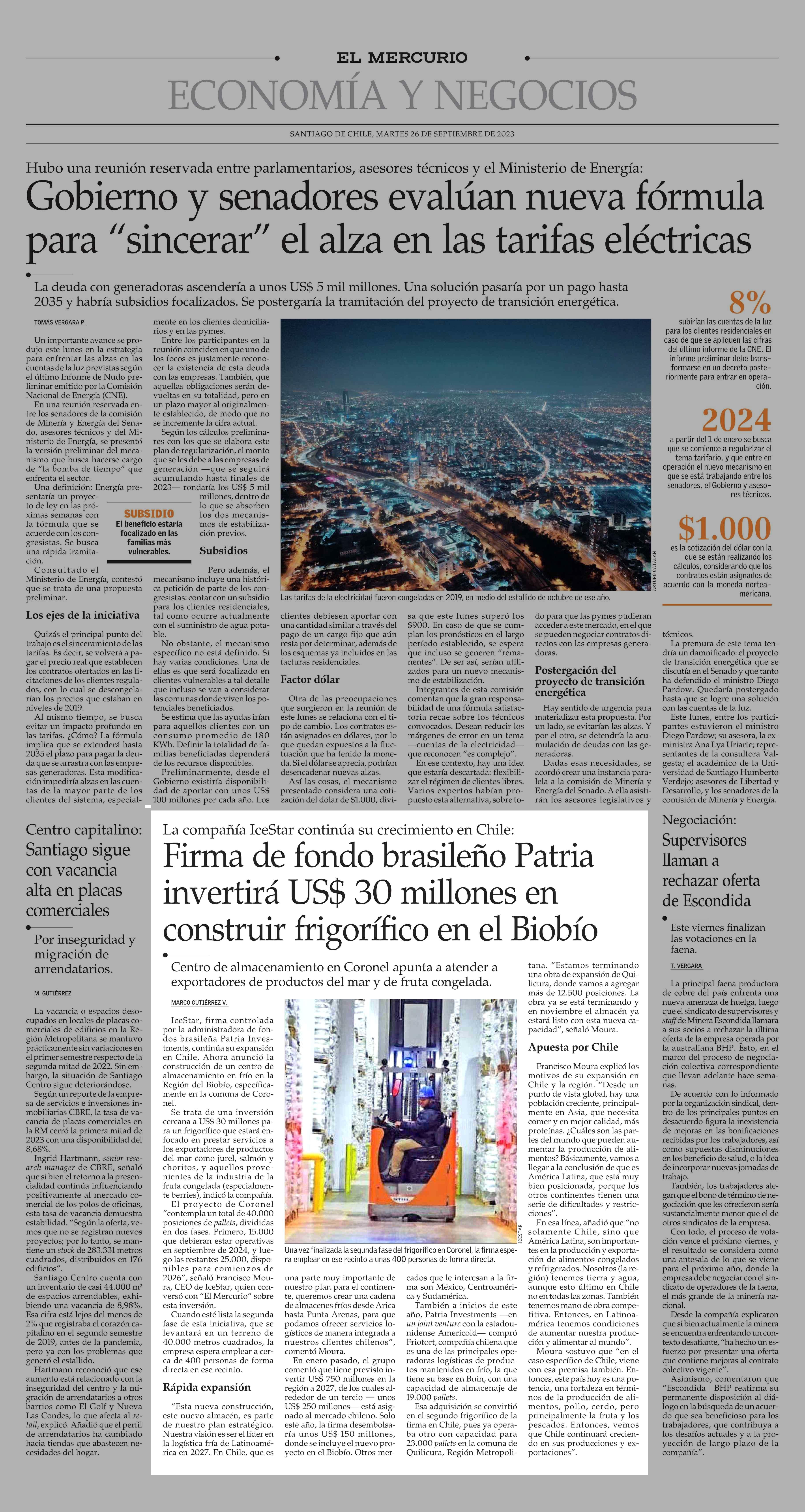 Firma de fondo brasileño Patria invertirá US$ 30 millones en construir frigorífico en el Biobío 26-09-2023 El Mercurio |