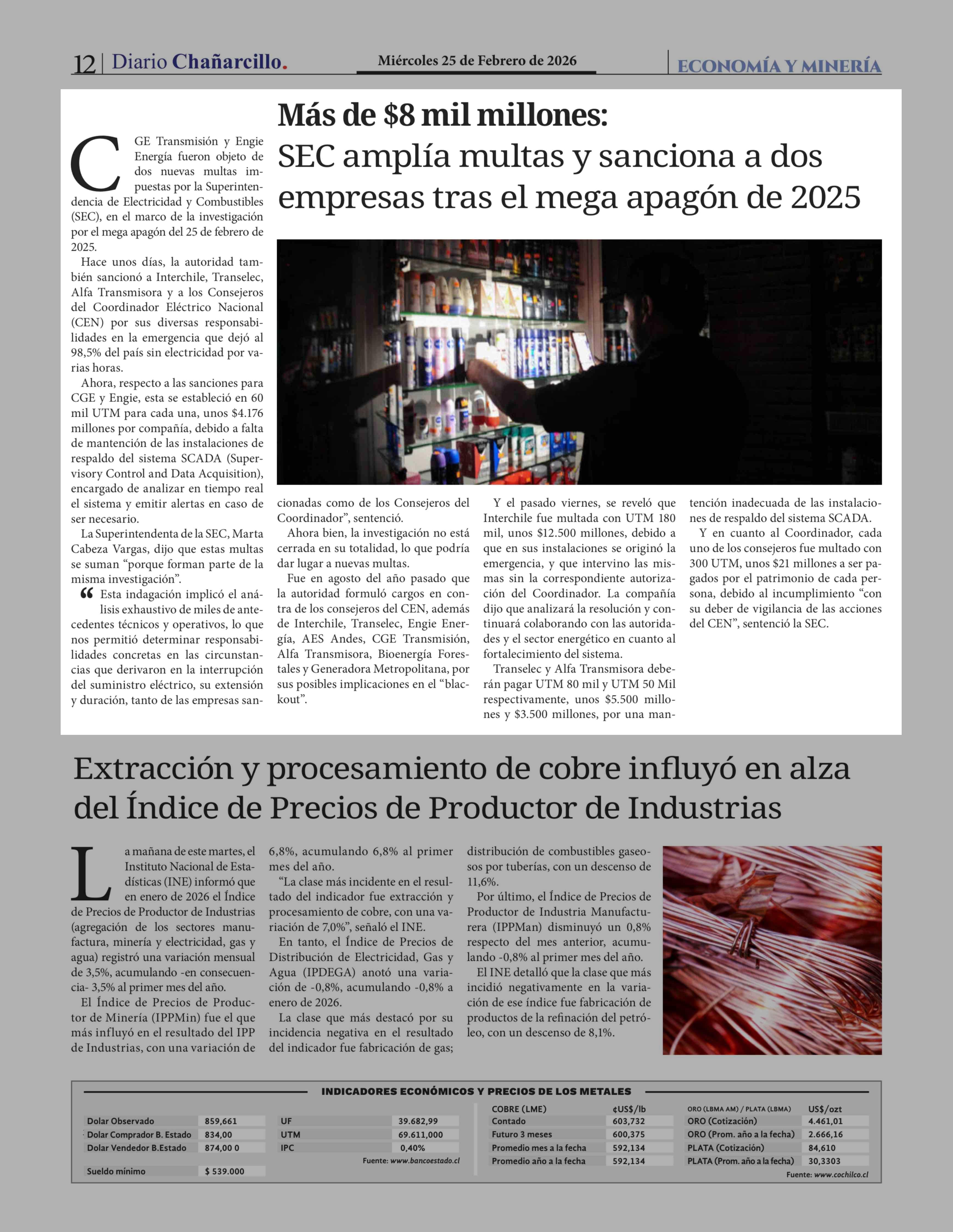 Más de $8 mil millones: SEC amplía multas y sanciona a dos empresas tras el mega apagón de 2025 25-02-2026 Diario Chañarcillo |