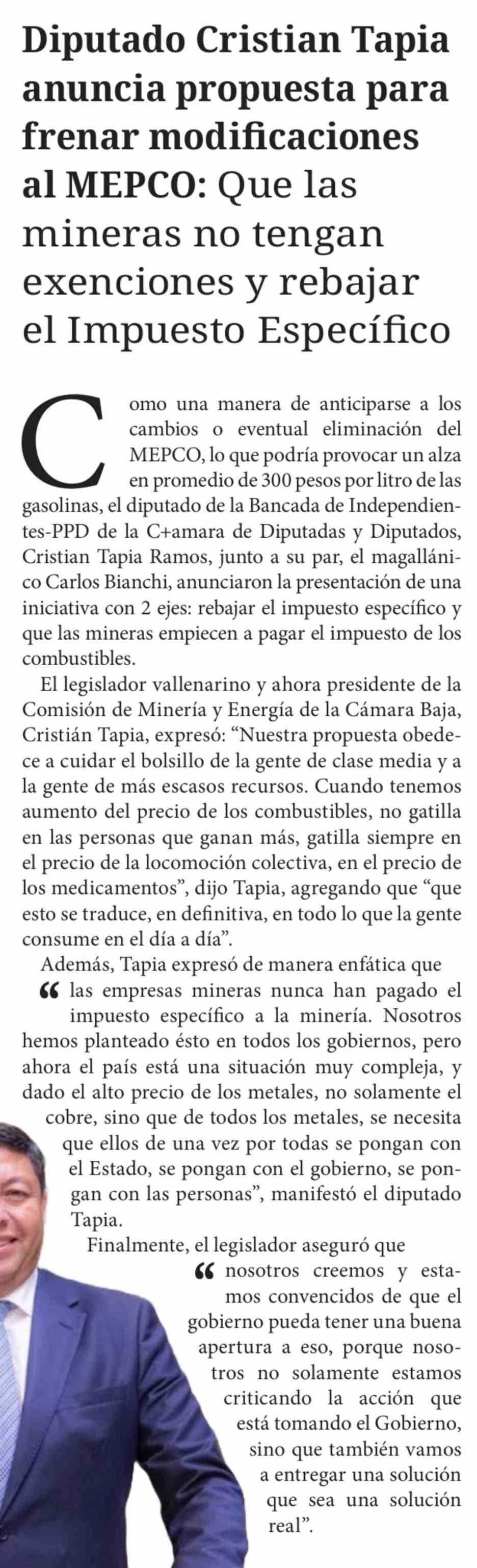 | Título: | Diputado Cristian Tapia anuncia propuesta para frenar modificaciones al MEPCO: Que las mineras no tengan exenciones y rebajar el Impuesto Específico |