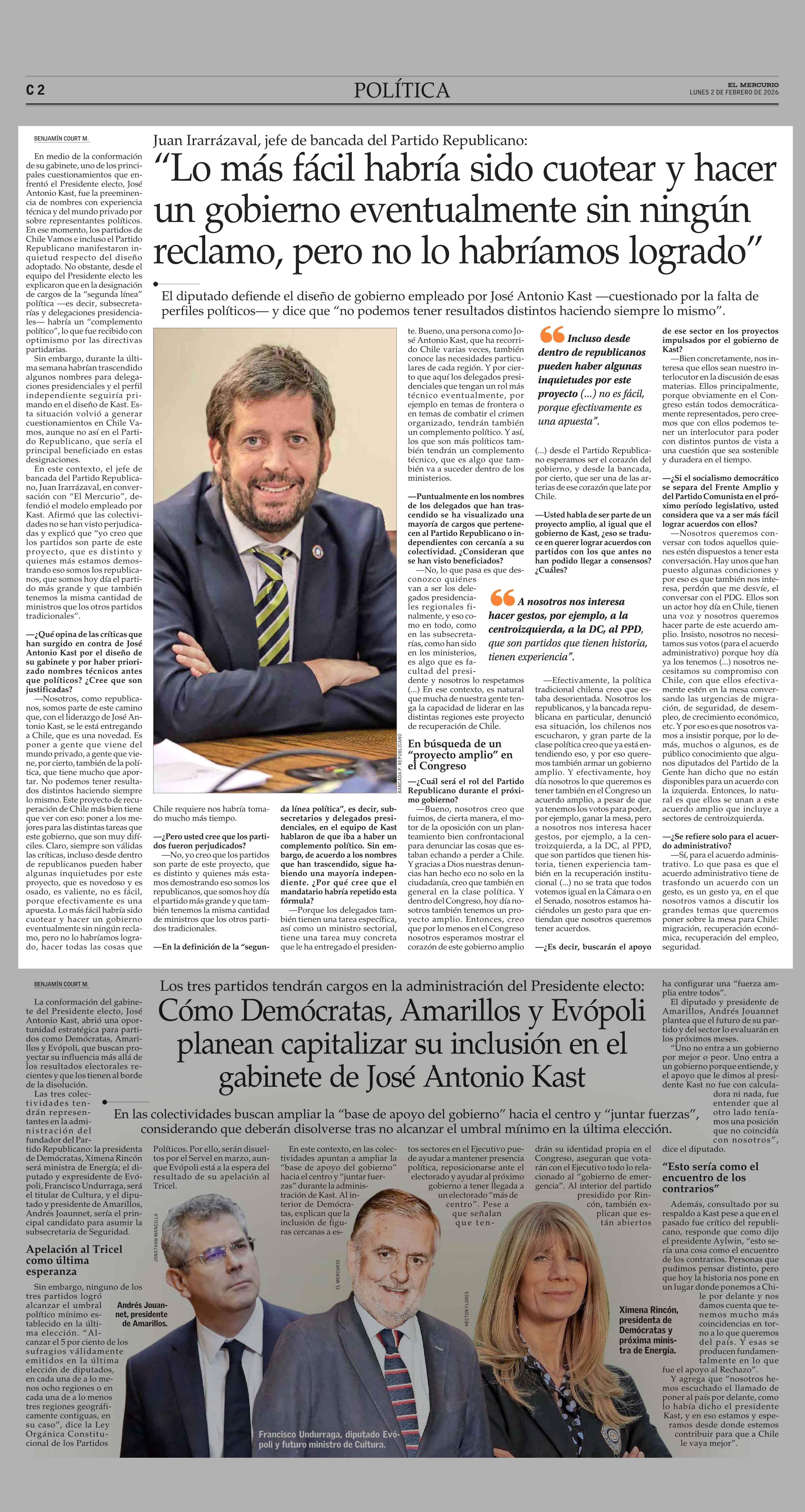 “Lo más fácil habría sido cuotear y hacer un gobierno eventualmente sin ningún reclamo, pero no lo habríamos logrado” 02-02-2026 El Mercurio |