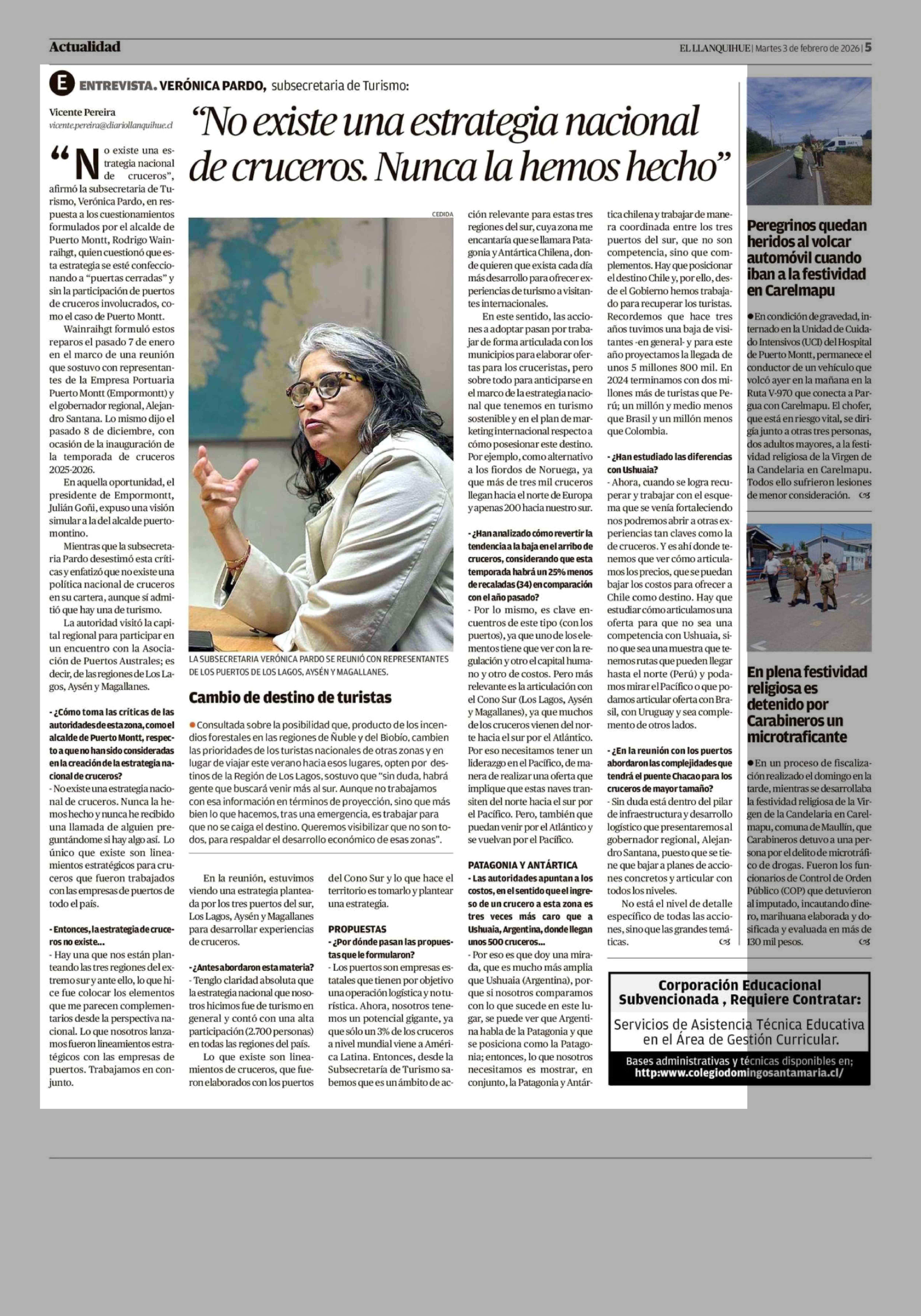 "No existe una estrategia nacional de cruceros. Nunca la hemos hecho" 03-02-2026 El Llanquihue |
