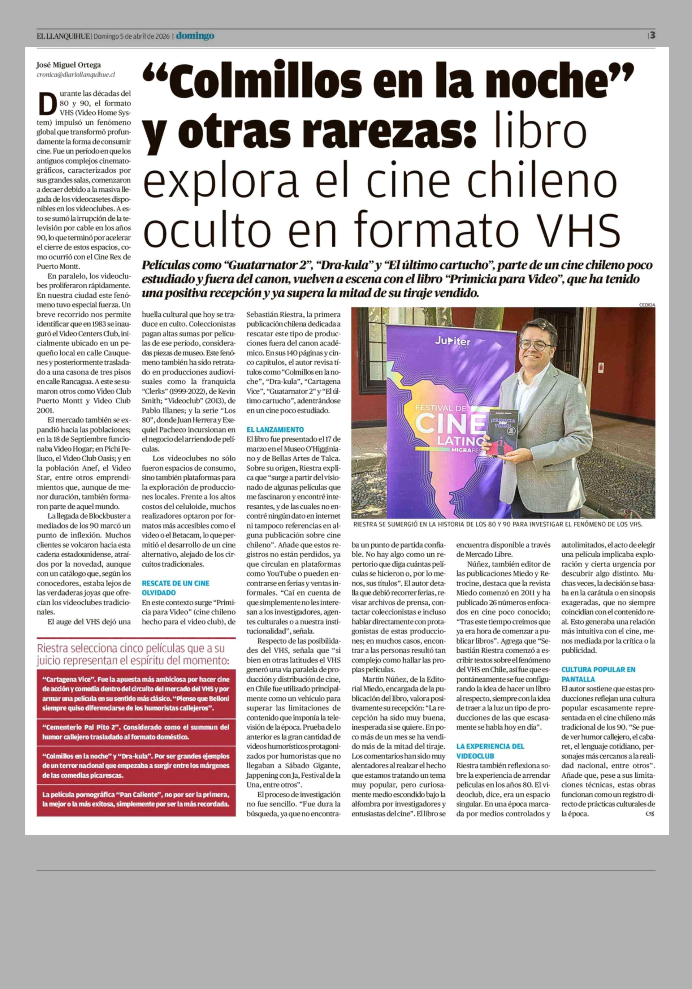"Colmillos en la noche" y otras rarezas: libro explora el cine chileno oculto en formato VHS 05-04-2026 El Llanquihue |