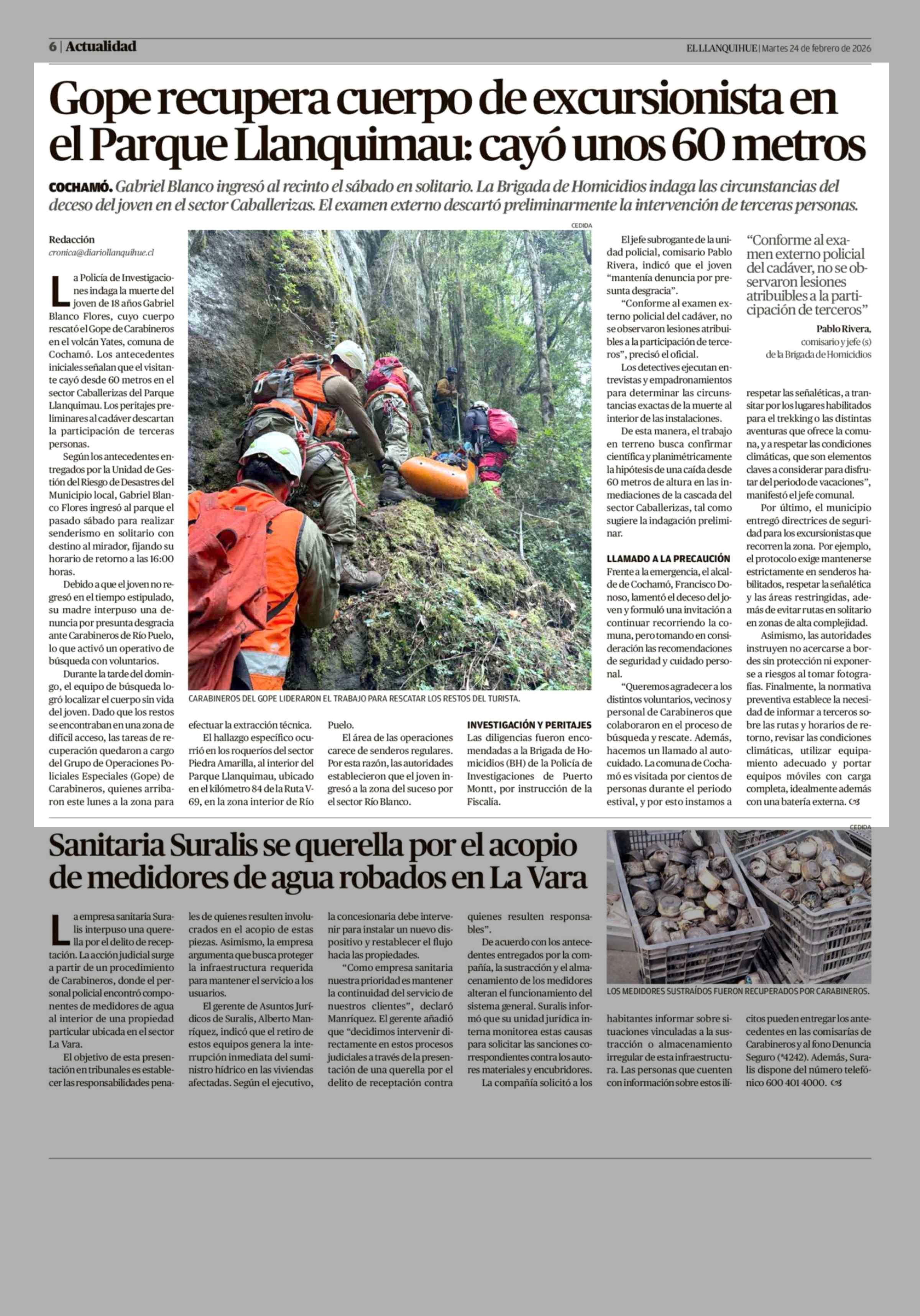 Gope recupera cuerpo de excursionista en el Parque Llanquimau: cayó unos 60 metros 24-02-2026 El Llanquihue |