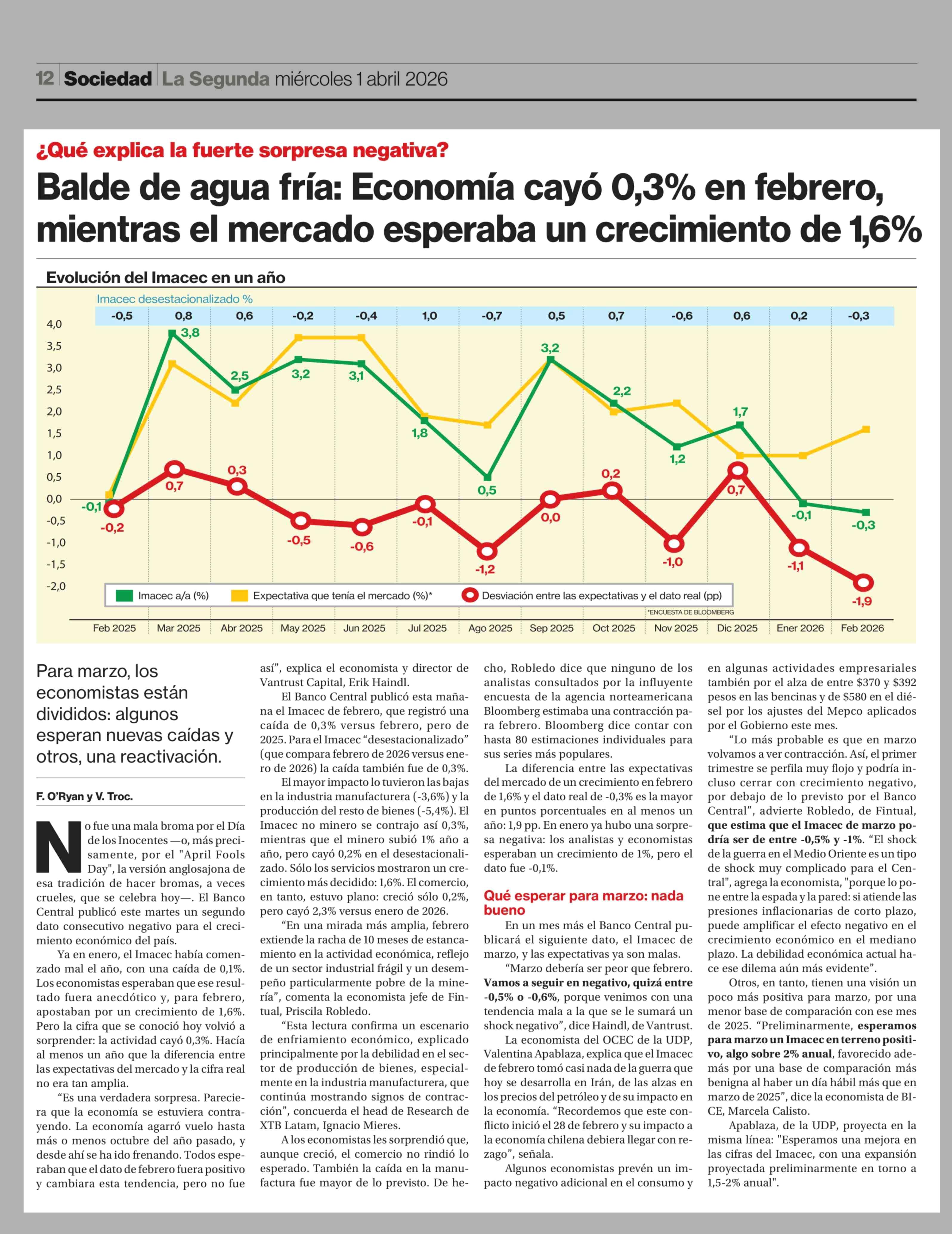 Balde de agua fría: Economía cayó 0,3% en febrero, mientras el mercado esperaba un crecimiento de 1,6% 01-04-2026 La Segunda |