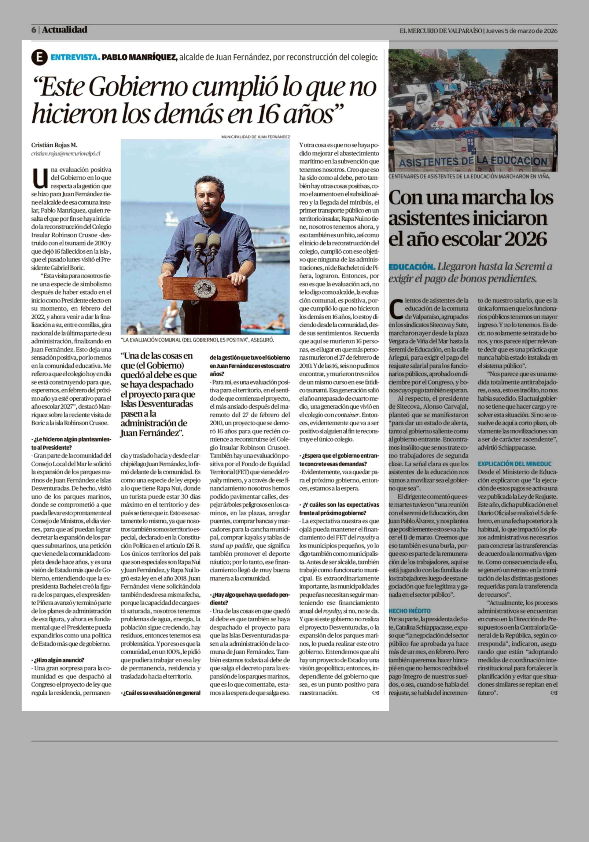 "Este Gobierno cumplió lo que no hicieron los demás en 16 años" 05-03-2026 El Mercurio de Valparaíso |