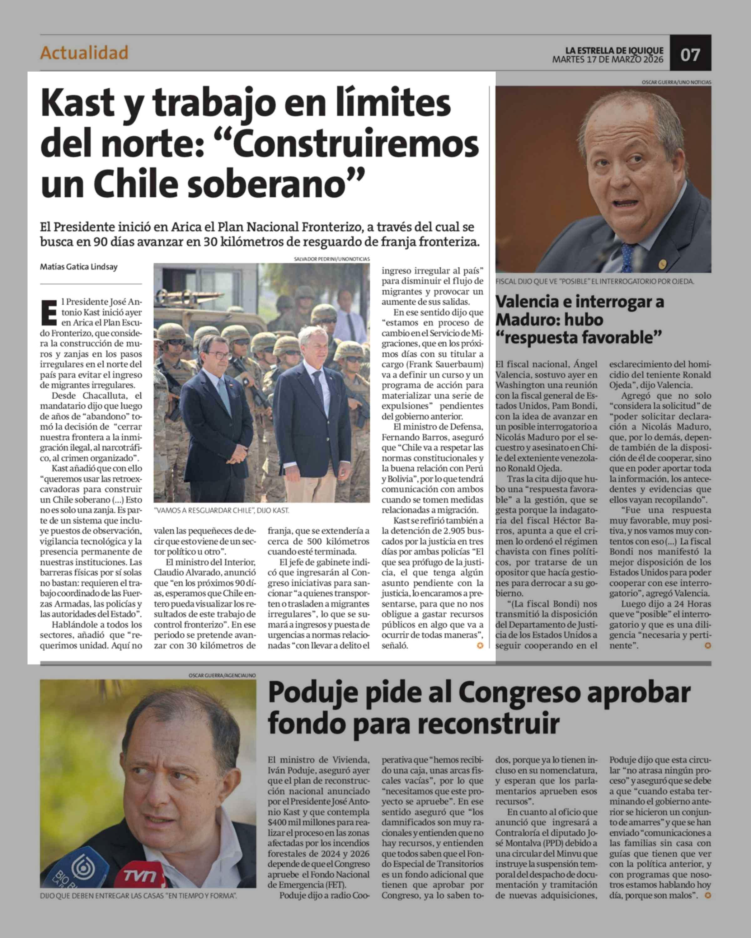 Kast y trabajo en límites del norte: "Construiremos un Chile soberano" 17-03-2026 La Estrella de Iquique |