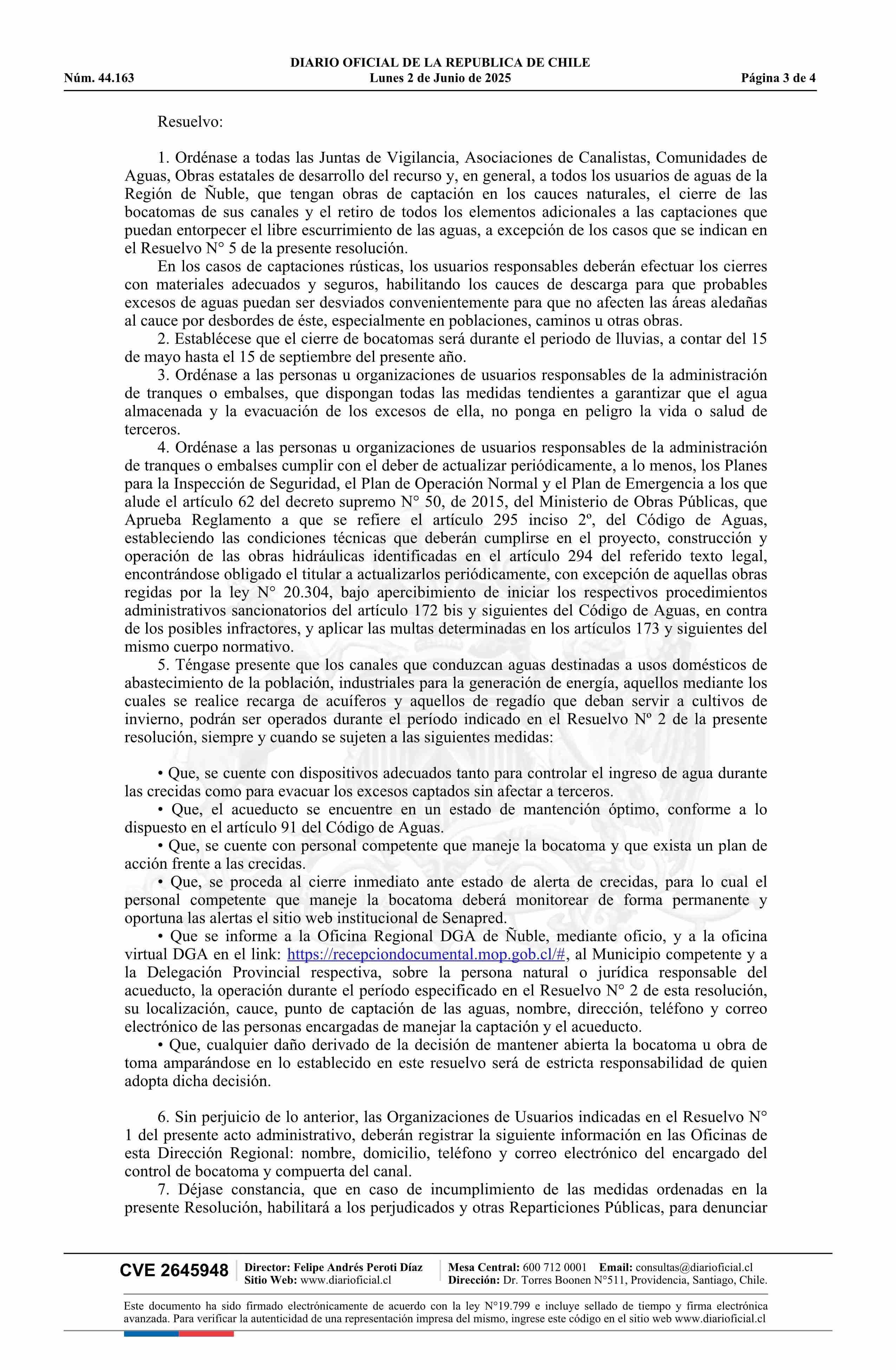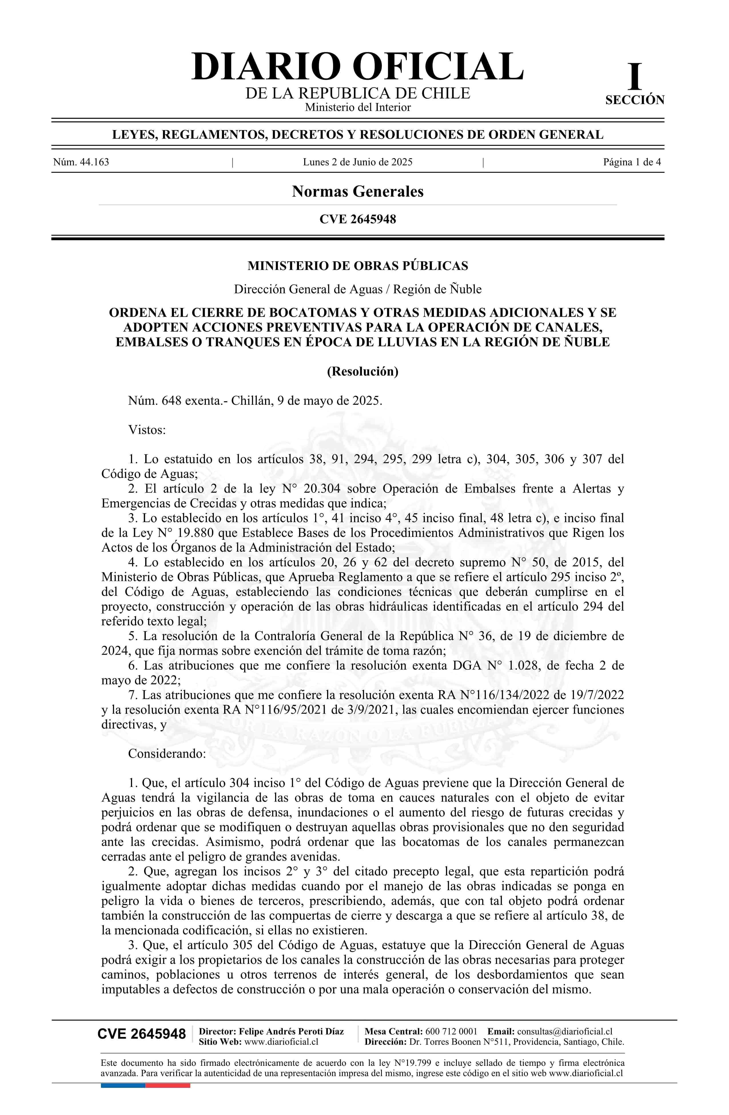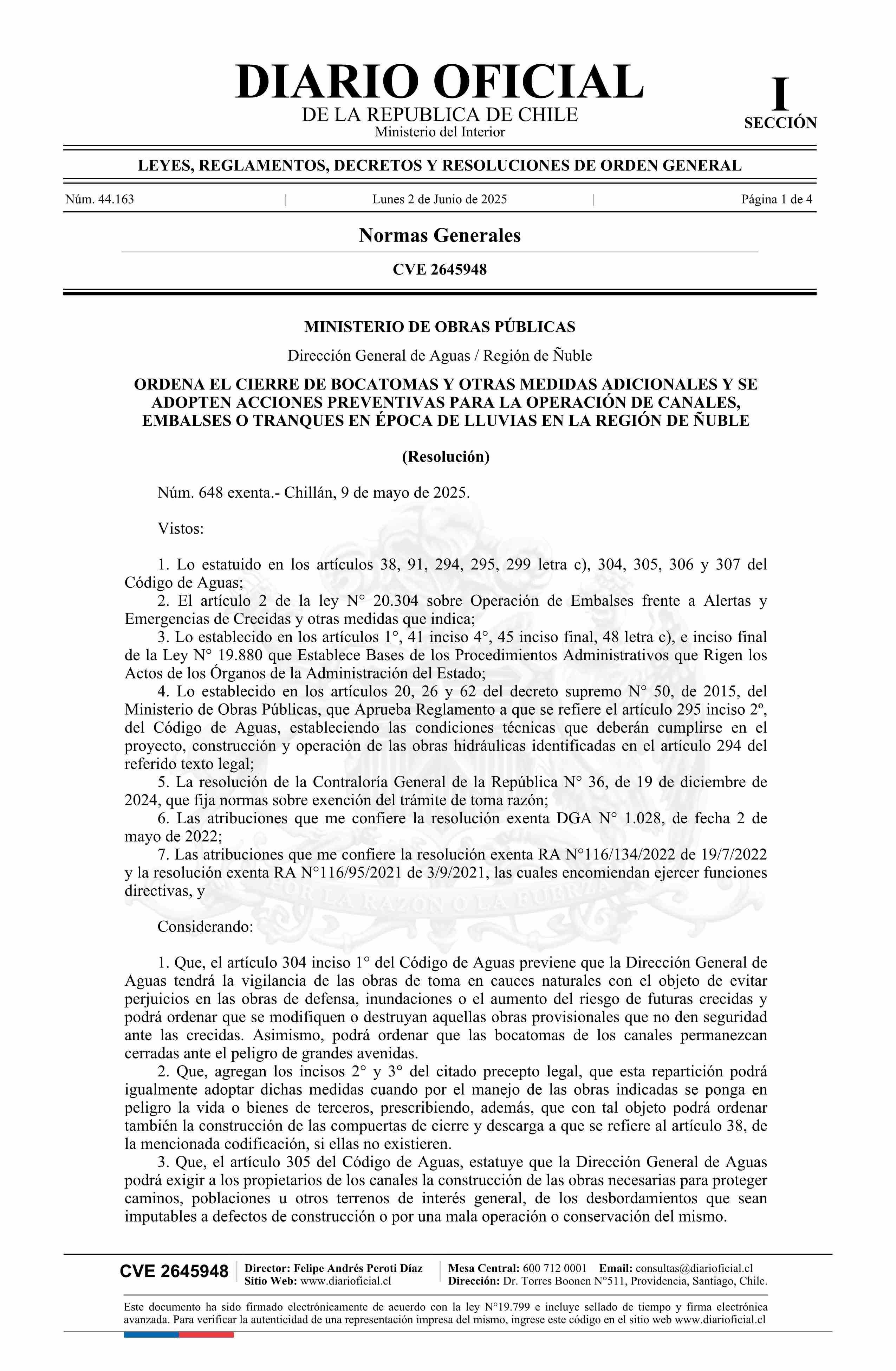 | Título: | Resolución exenta número 648, de 2025.- Ordena el cierre de bocatomas y otras medidas adicionales y se adopten acciones preventivas para la operacion de canales, embalses o tranques en época de lluvias en la Región de Ñuble |
