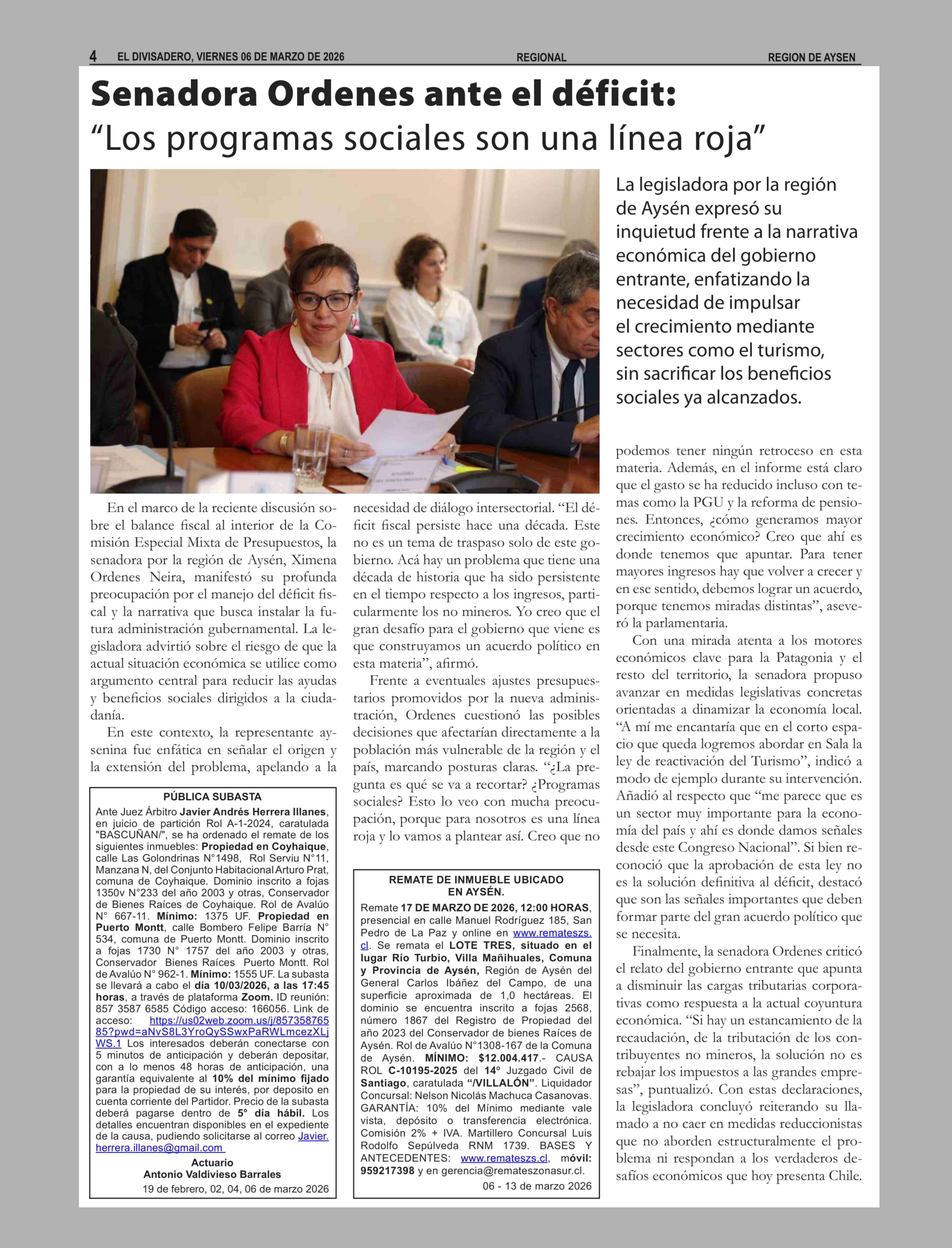 Senadora Ordenes ante el déficit: "Los programas sociales son una línea roja" 06-03-2026 El Divisadero |