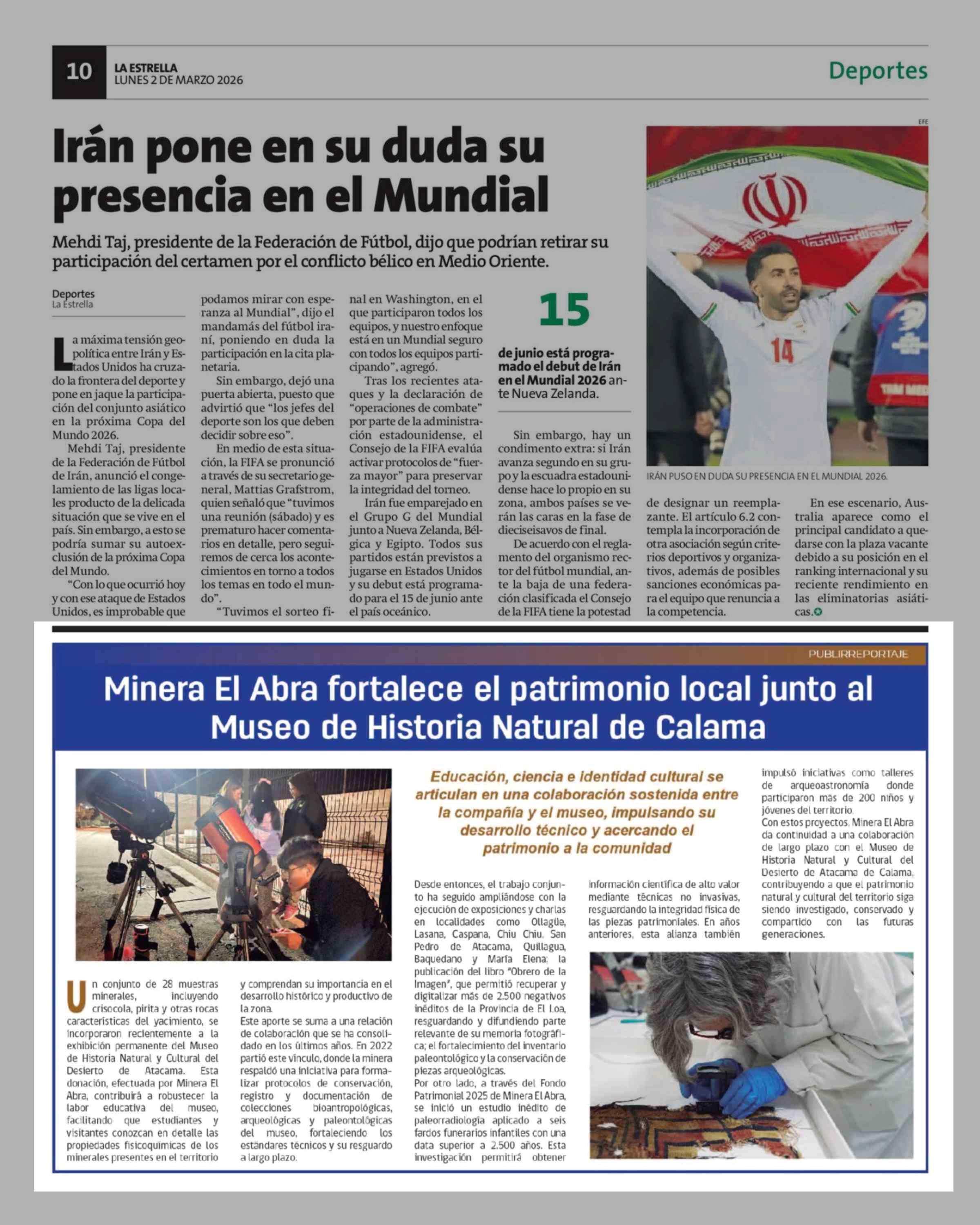 Minera El Abra fortalece el patrimonio local junto al Museo de Historia Natural de Calama 02-03-2026 La Estrella de Antofagasta |