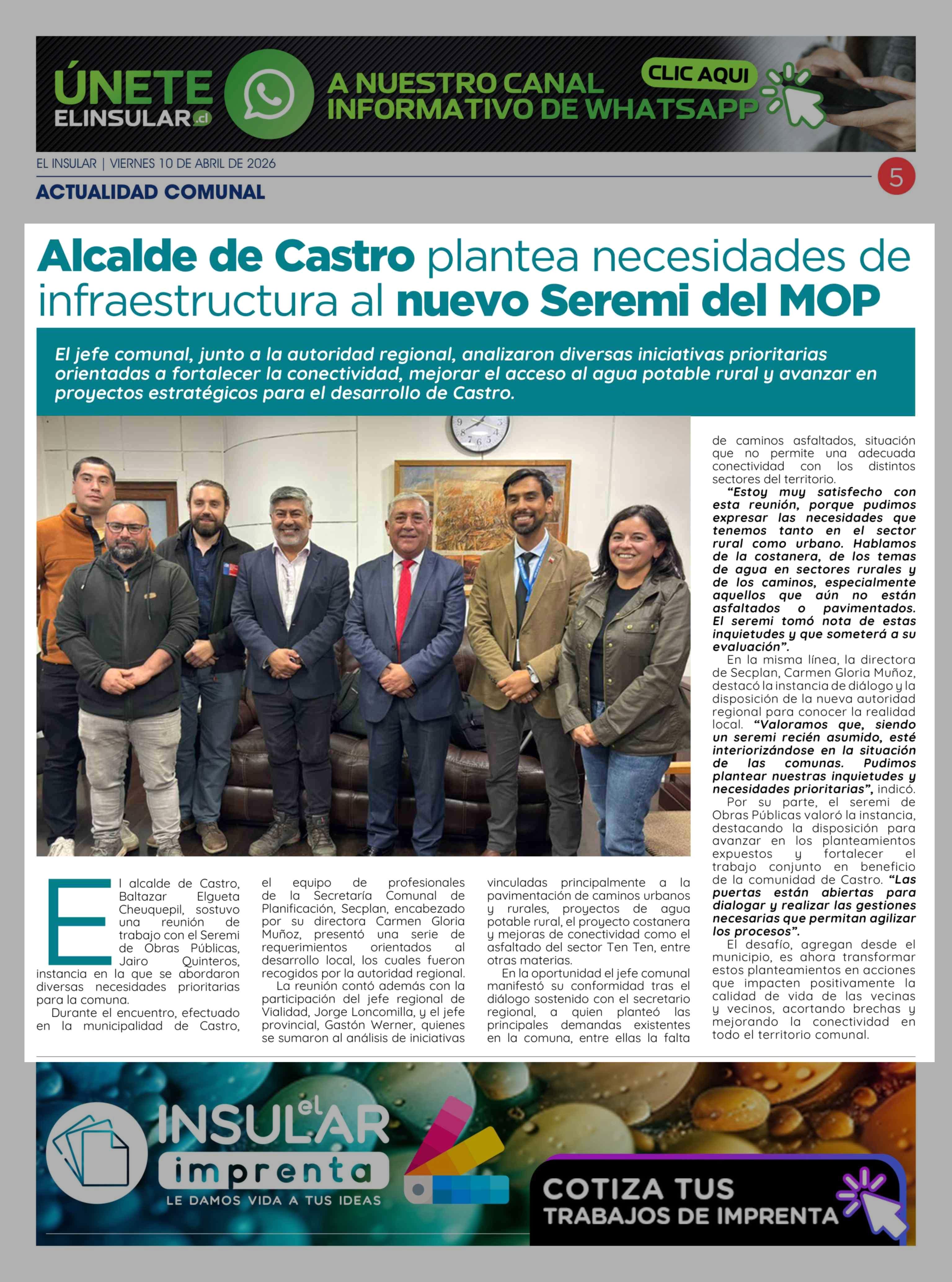 Alcalde de Castro plantea necesidades de infraestructura al nuevo Seremi del MOP 10-04-2026 El Insular |